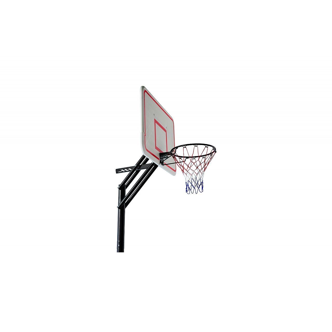 Баскетбольний набір з регульованою висотою кошика. Дошка з кошиком кріпиться до жердини на стрілі. Баскетбольне кільце нахиляється. Висоту можна регулювати відповідно до навичок гравців. Дошку з кошиком розміром 110 см х 70 см прикріпили до жердини на стрілі. Баскетбольне кільце нахиляється. Кошик має вініловий резервуар, який при наповненні водою або піском. Для зручності переміщення баскетбольного набору бак оснащений транспортними колесами. Металеві елементи покриті порошковою фарбою.