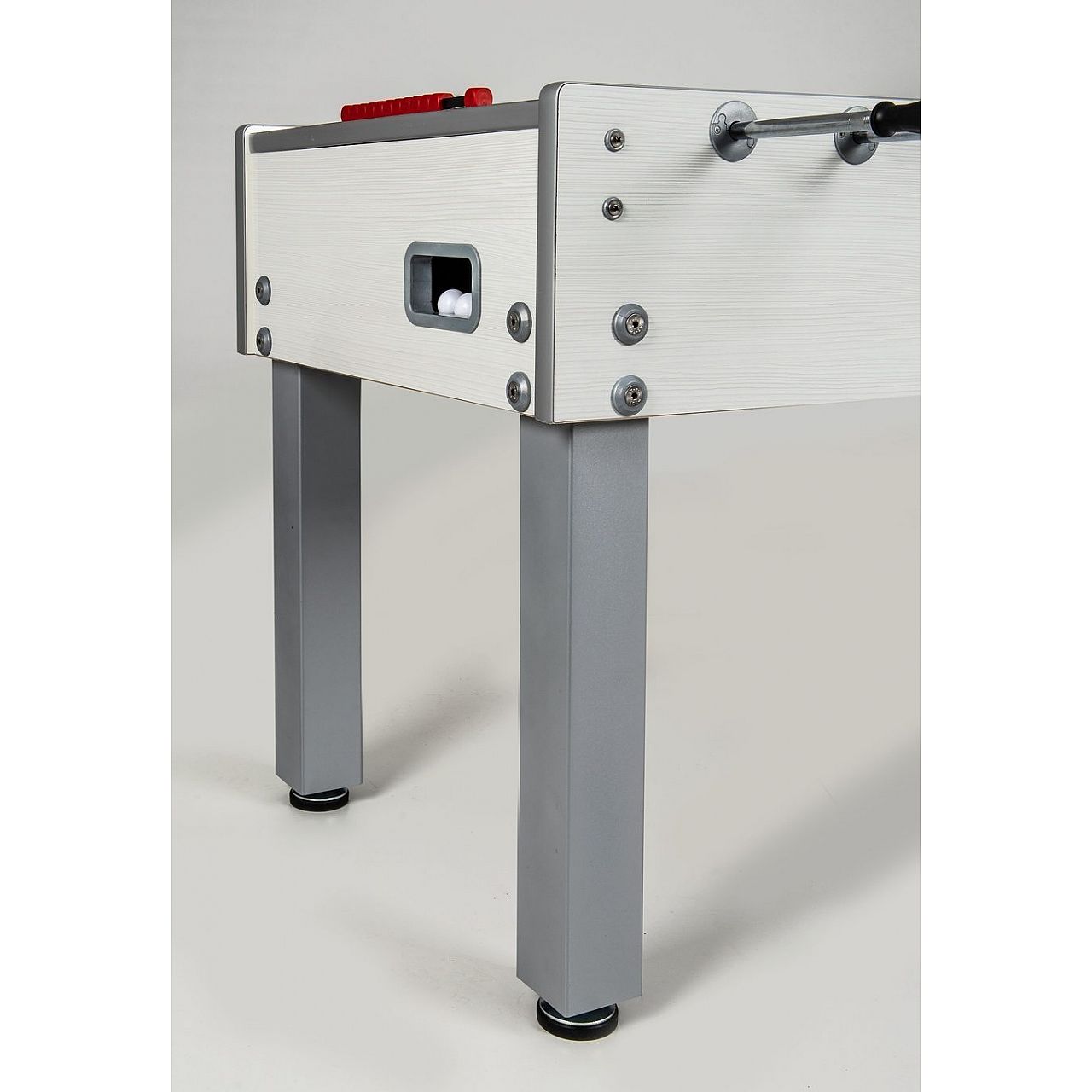 якісні футбольні фанати з пластиковим ламінатом. Надміцні ніжки зі сталі, покриті порошковим лаком. Имеет прививатели ног для об'єднання ідеально рівного ігрового поля на нерівній поверхні е востановление м'яча через виходити на кожен гол. У телеспічних стержнях стержень меншого діаметра скользить всередині стержня гравця, кінець якого не виходить з корпусу.