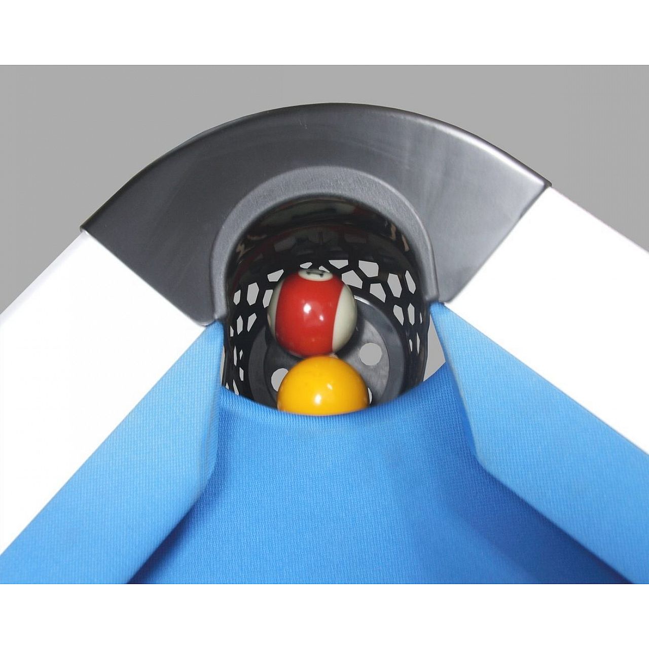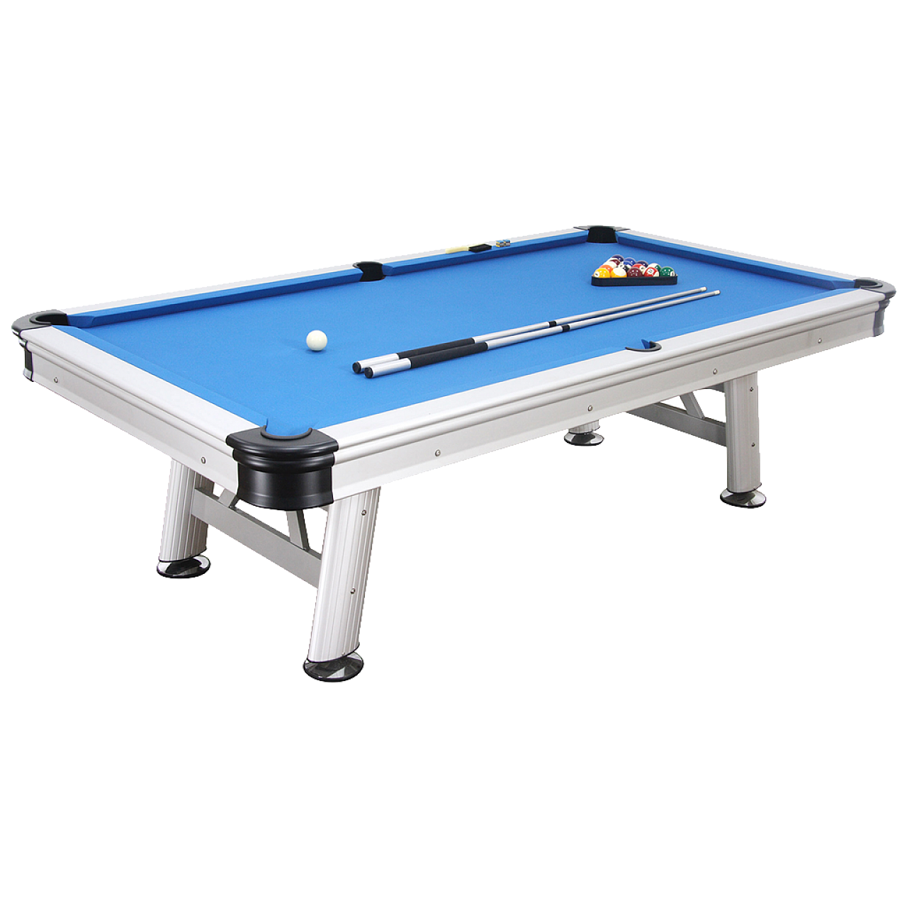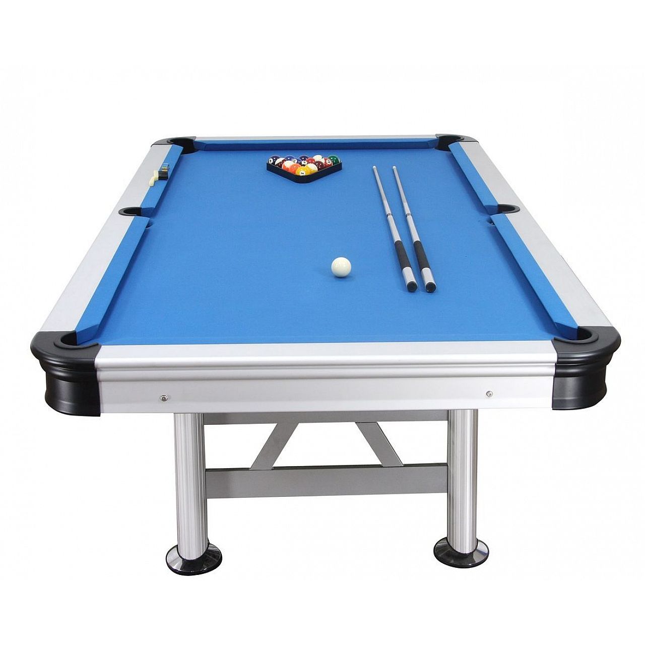 Цей більярдний стіл у сучасному стилі, що підходить для використання на відкритому повітрі, виготовлений із вологостійких матеріалів. Сидерична синя тканина та оригінальна комбінація чорного алюмінію з корпусом надають столу розкішного вигляду, створюючи унікальний продукт серед більярдних столів.