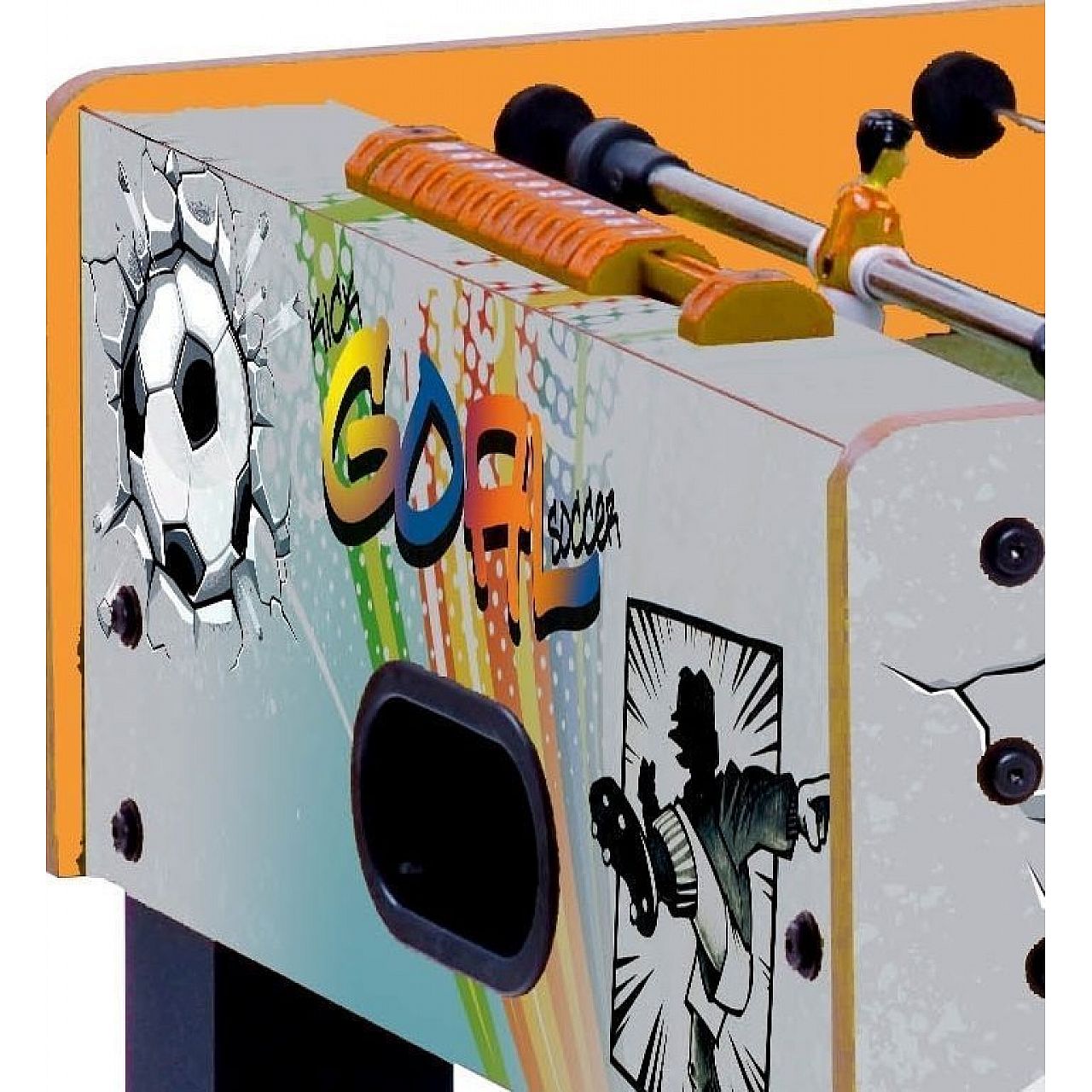 Футбольний стіл з привабливою графікою, покликаний доставити масу задоволення гравцям-початківцям. F-1 Goal виготовлений з якісних матеріалів з великою увагою до деталей та пропонує інноваційні рішення, такі як телескопічні дуги безпеки та вирівнювачі ніг. Завдяки дуже гарному співвідношенню ціна/якість, цей стіл виділяється серед багатьох інших у тій же категорії. F-1 Goal відповідає гармонізованим європейським правилам безпеки EN 71-1, 2, 3 та 9.