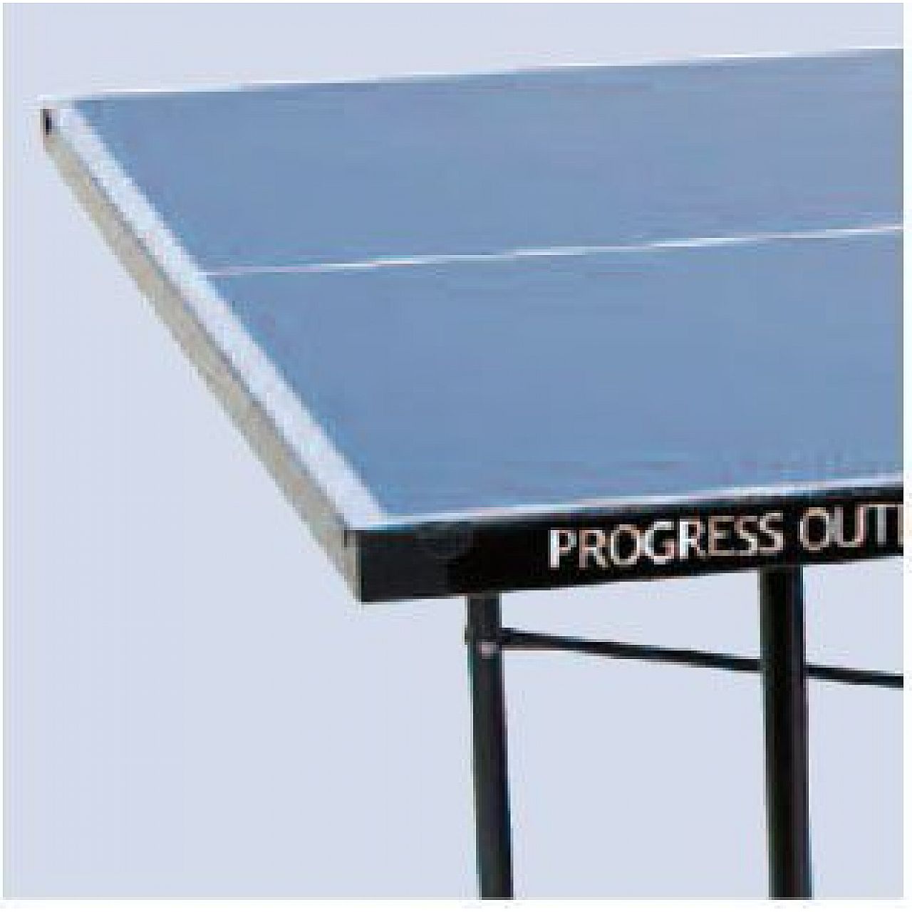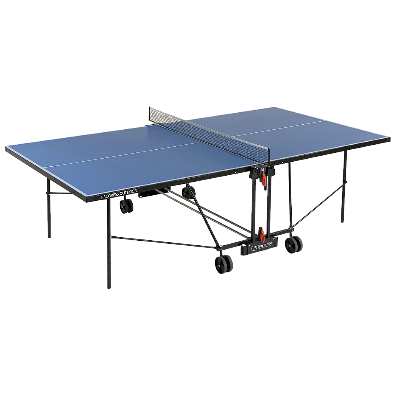 Відкритий тенісний стіл, складний з автоматичною системою блокування, офіційний розмір для змагань, ідеально підходить для сім'ї та відпочинку. Доступний із синім верхом. Верхня структура з полімерних ламінатних панелей товщиною 4 мм з профілем металевої трубки товщиною 36 мм, незмінними білими лініями та покриттям антивідблиску. Сітка та стійки вмонтовані, їх не потрібно знімати перед складання столу. Рама та ніжки: металева трубка діаметром 25 мм, покрита порошковою фарбою. Кульова опора у комплекті. Чотири подвійні колеса діаметром 125 мм, два з яких обертаються на 360°, спрощують переміщення при складеному столі. Ракетки та м'ячі поставляються за запитом