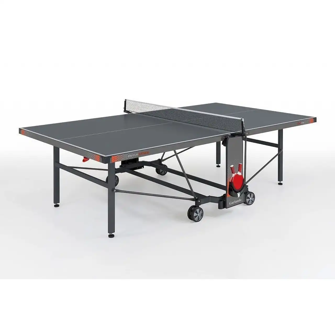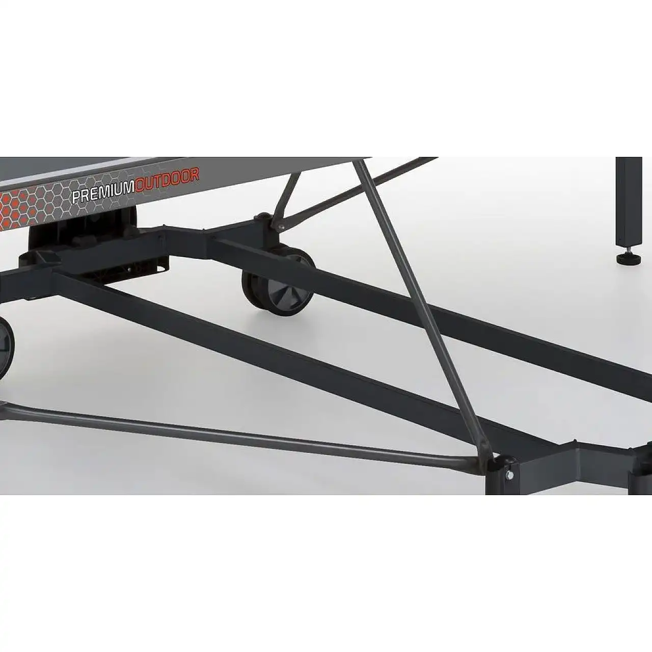 Всепогодний тенісний стіл, доладний, офіційного змагального розміру, рекомендується для інтенсивного використання в рекреаційних цілях. Ідеально підходить для шкіл, організацій та клубів. Оснащений компактним автоматичним замикаючим механізмом і регульованим натягом сітки. Ергономічна система ECS з ручками по обидва боки дозволяє легко відкривати їх. Верхні частини оригінального сірого кольору з покриттям антивідблиску матеріалу для забезпечення оптимального відштовхування м'яча. Надзвичайно міцний, завдяки своїй конструкції з квадратними ніжками та сполучними балками, Premium Outdoor легко складається та переноситься завдяки подвійним колесам.
