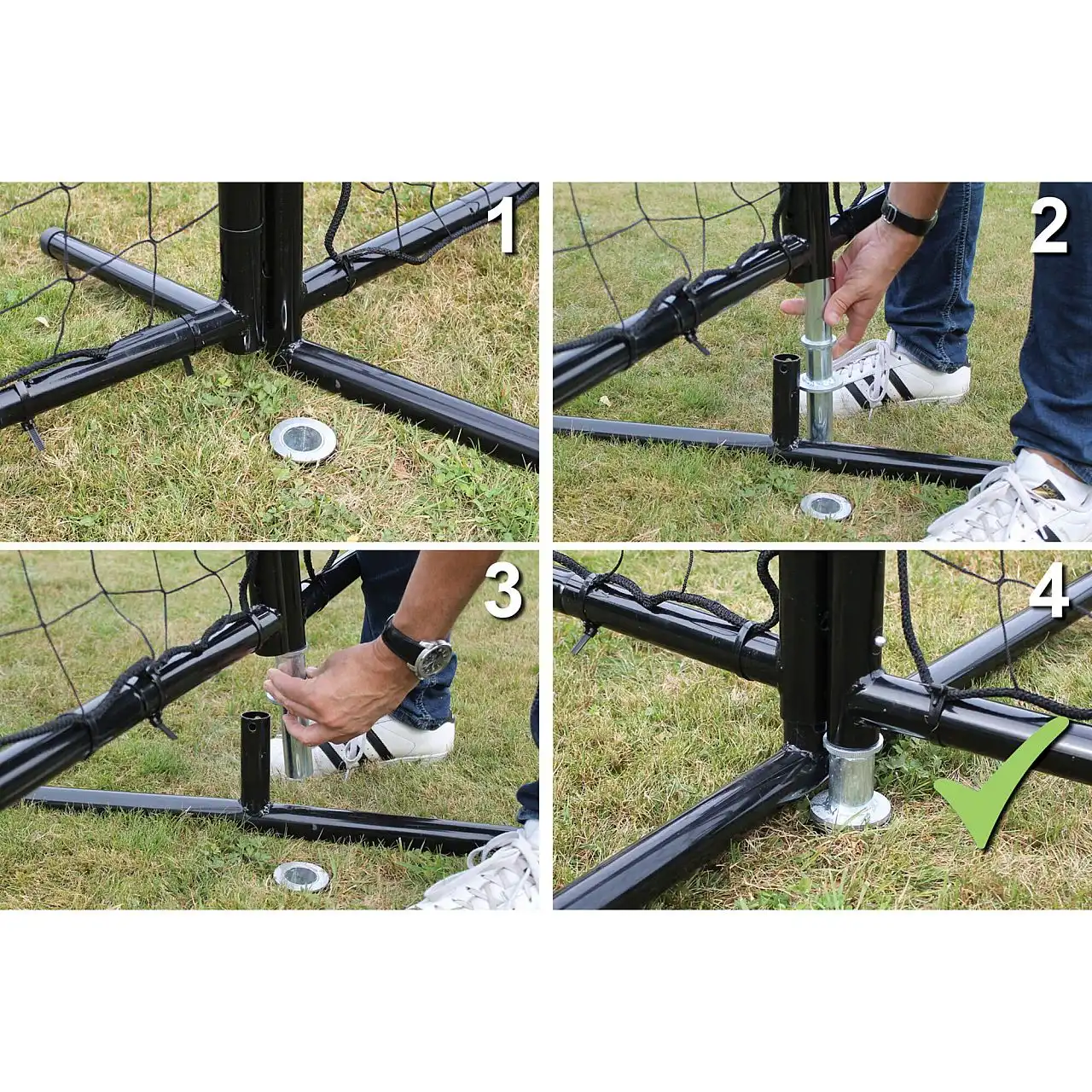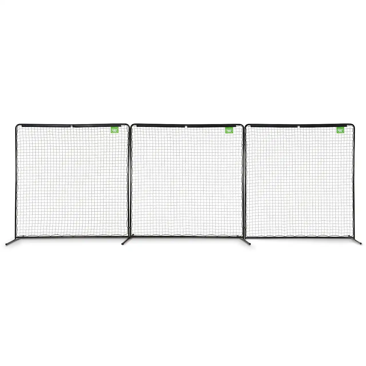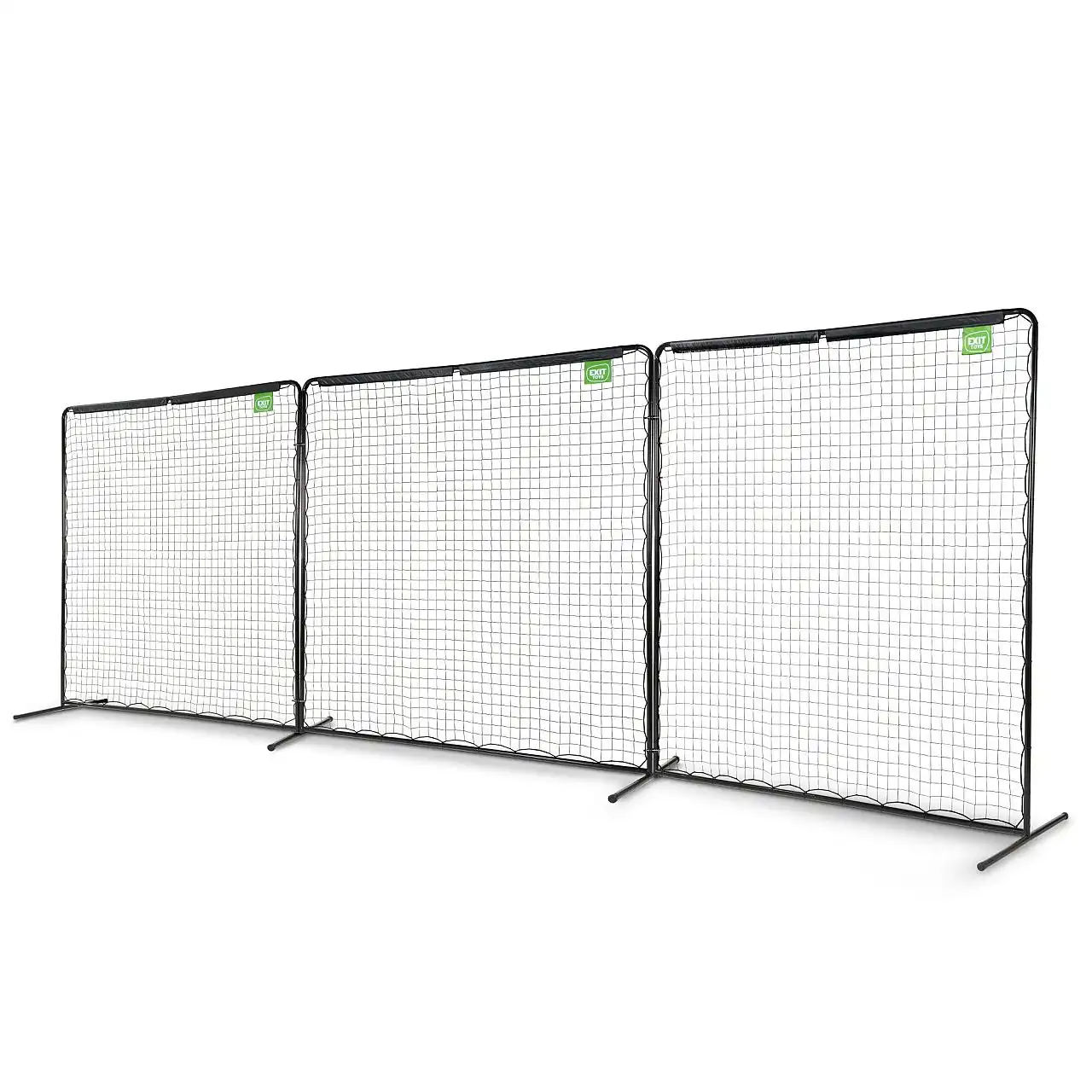 Сітка для м'ячів складається з трьох чорних рамок, кожна розміром 300 x 300 см, які можна прикріплювати одну до одної на висоті до 6 метрів і ширині до 3 метрів. Рама оцинкована і має порошкове покриття, що забезпечує довгий термін служби і красивий зовнішній вигляд. Горизонтальні ніжки, закріплені за допомогою кілочків і заземляючого анкера, гарантують, що спортивна сітка залишиться на місці навіть при найсильнішому ударі по м'ячу.