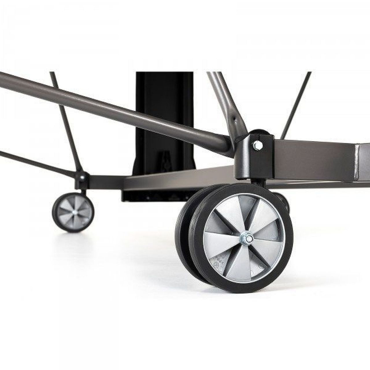 Використання чотирьох підвійних коліс із гумовим протектором полегшує транспортування столу. У складеному вигляді займає зовсім небагато місця, незважаючи на великі розміри.