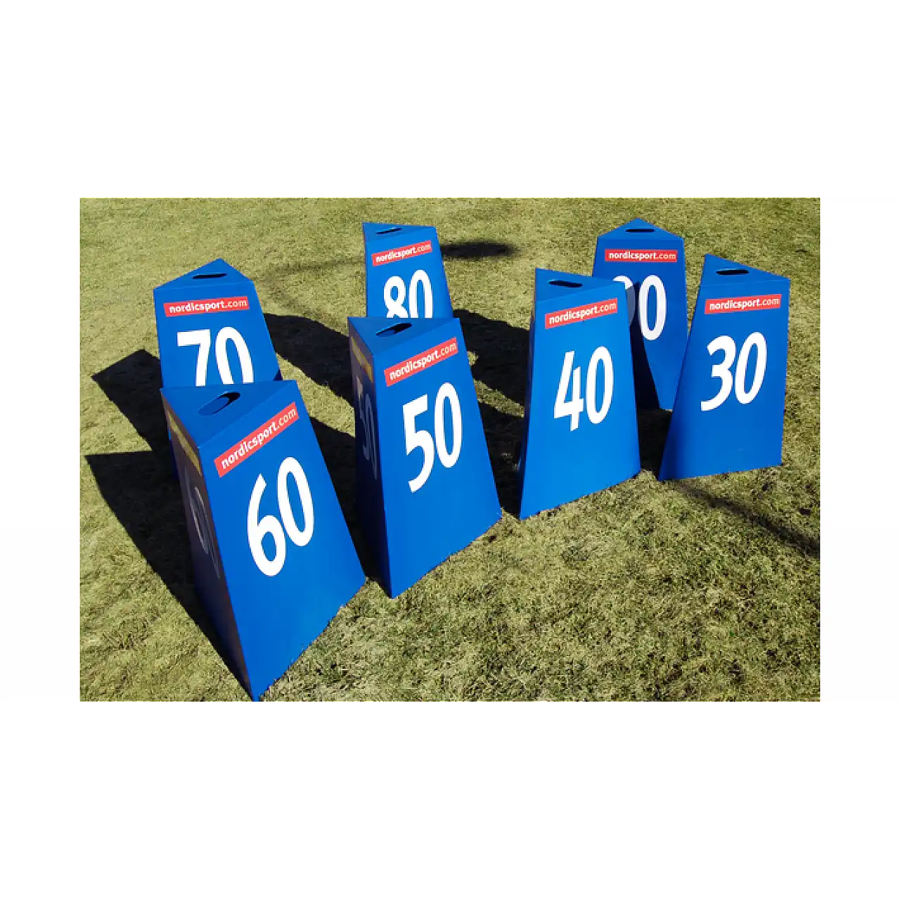 Набір з 5 шт. маркерів дистанції 14, 16, 18, 20 і 22 м. Мітка дистанції виготовлена з синього поліетилену, який є еластичним і міцним. З ручкою у верхній частині для кращого укладання, щоб уникнути вакуумного замку. Кубик масою 2 кг кожен і висотою 63 см.