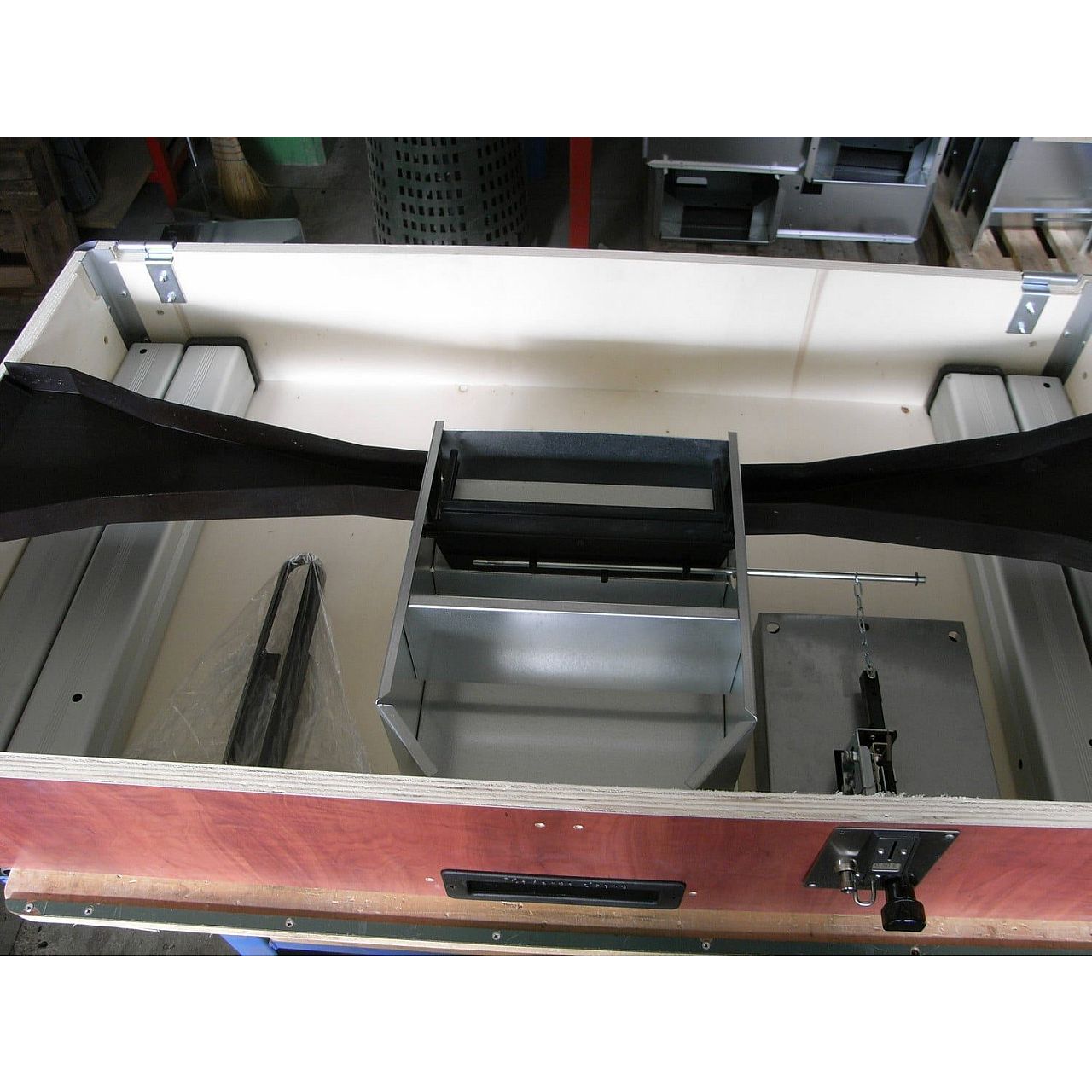 Двокомпонентний, багатошаровий корпус з тополі, покритий пластиковим ламінатом, який можна відклеїти двостулковими замками, щоб забезпечити доступ до внутрішньої частини столу та монетниці.