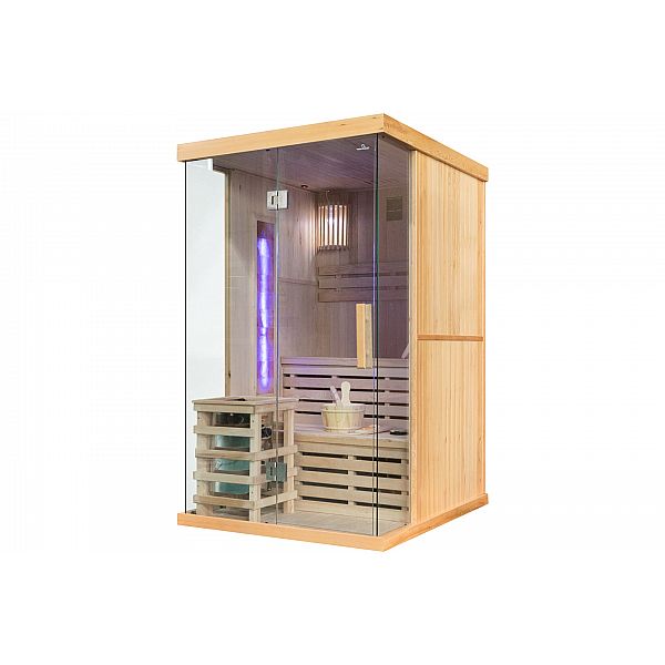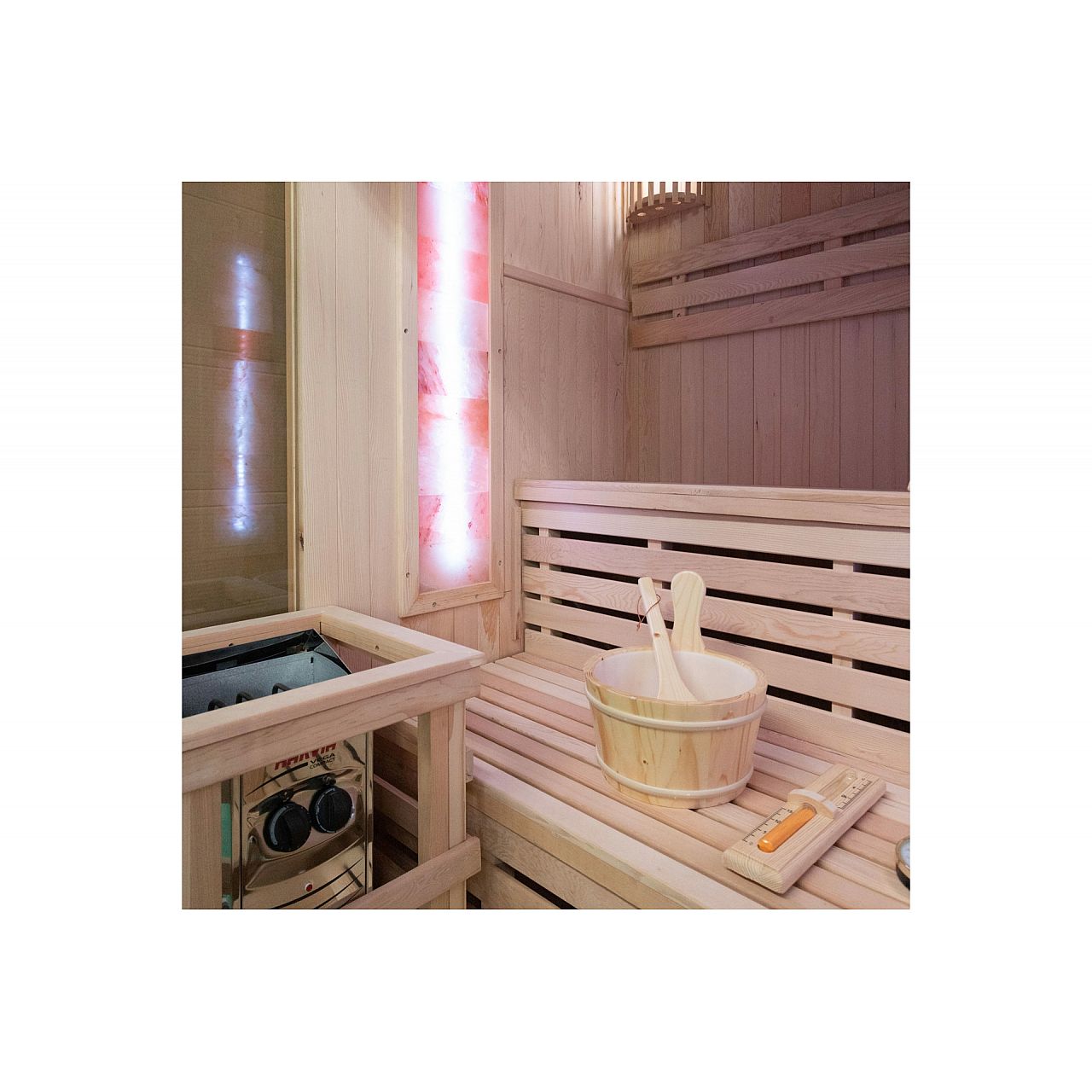 Основою кутової фінської сауни з соляними панелями EN2S є високоякісний електронагрівач з набором каменів , який дозволяє точно регулювати температуру, гарантуючи оптимальні умови для кожного сеансу. Щоб ще більше покращити атмосферу, ви можете використовувати відро та черпак, щоб побризкати водою на каміння , створюючи приємну пару, яка ніжно огорне вашу шкіру та посилить ефект сауни. Кутова сауна EN2S надзвичайно проста у використанні, а головне - не потребує приправ та зберігання дров. Просто підключіть електричну плиту до 230 В або 380 В (живлення) і почніть бажаний сеанс приблизно через 30 хвилин.