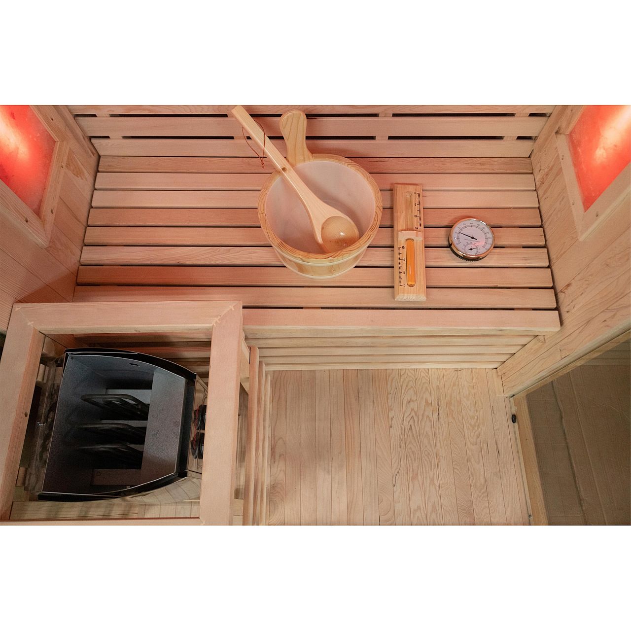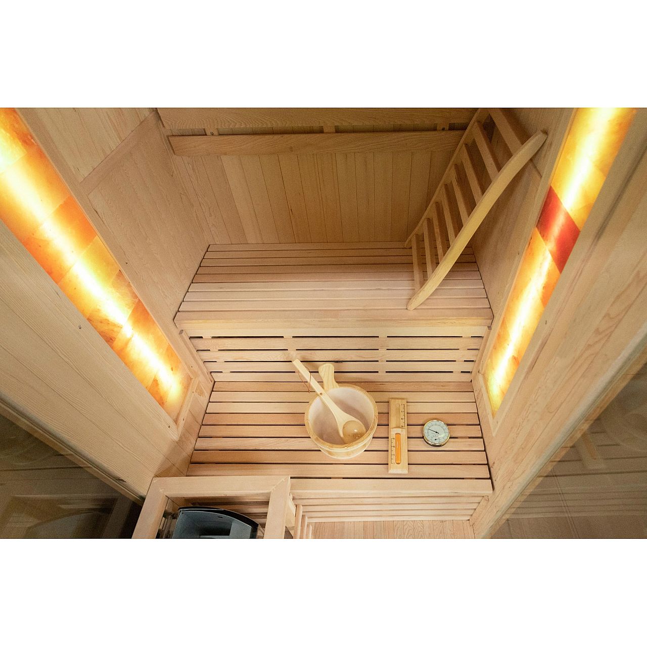 Традиційна фінська сауна працює шляхом інтенсивного нагріву тіла, що сприяє очищенню організму від шлаків, покращенню кровообігу та зміцненню імунітету . Однак ця модель має додавання соляних панелей, які збагачують повітря такими цінними елементами , як йод, магній, калій і кальцій. Завдяки цьому фінська сауна EN2S не тільки сприяє детоксикації та розслабленню, але й підтримує здоров’я дихальної системи.