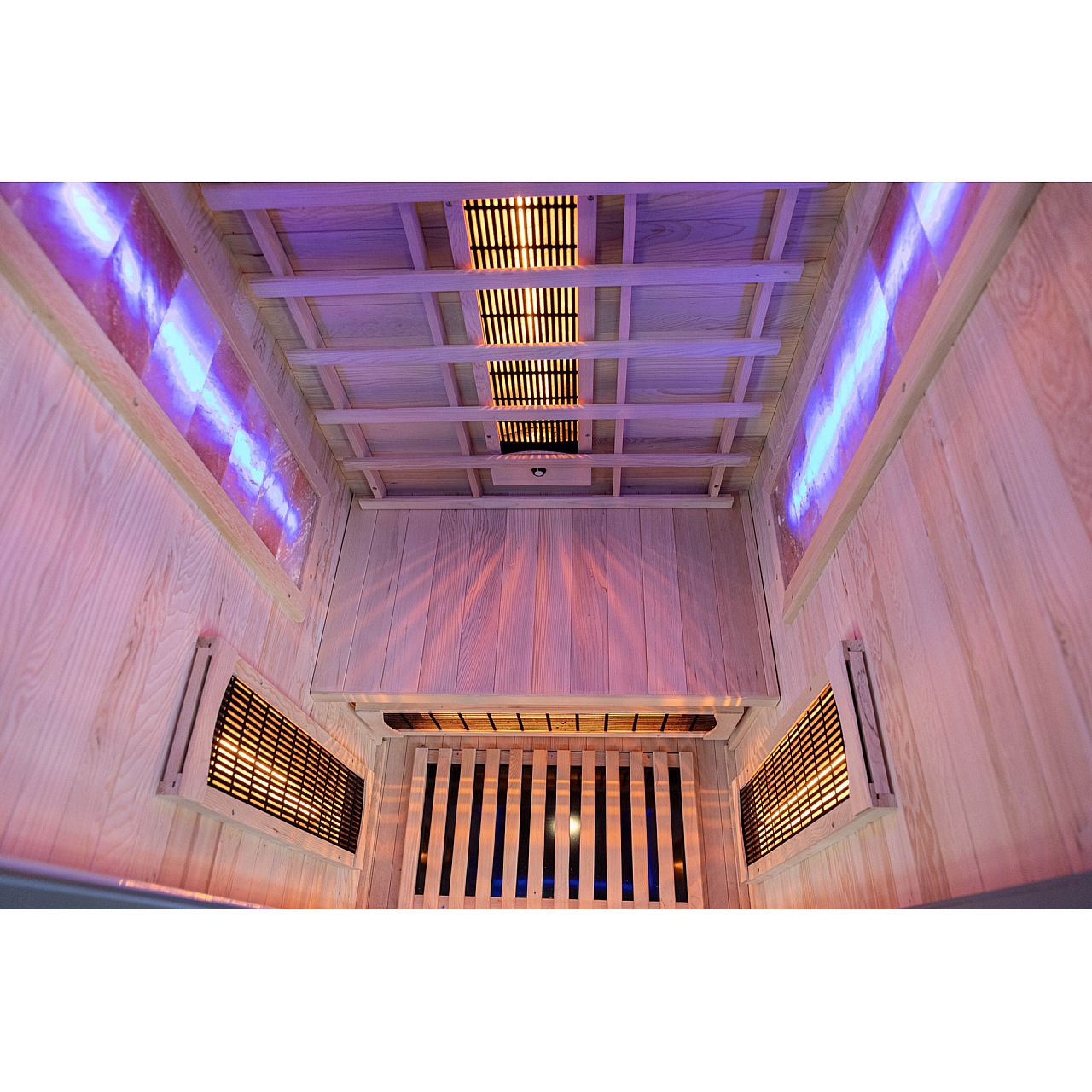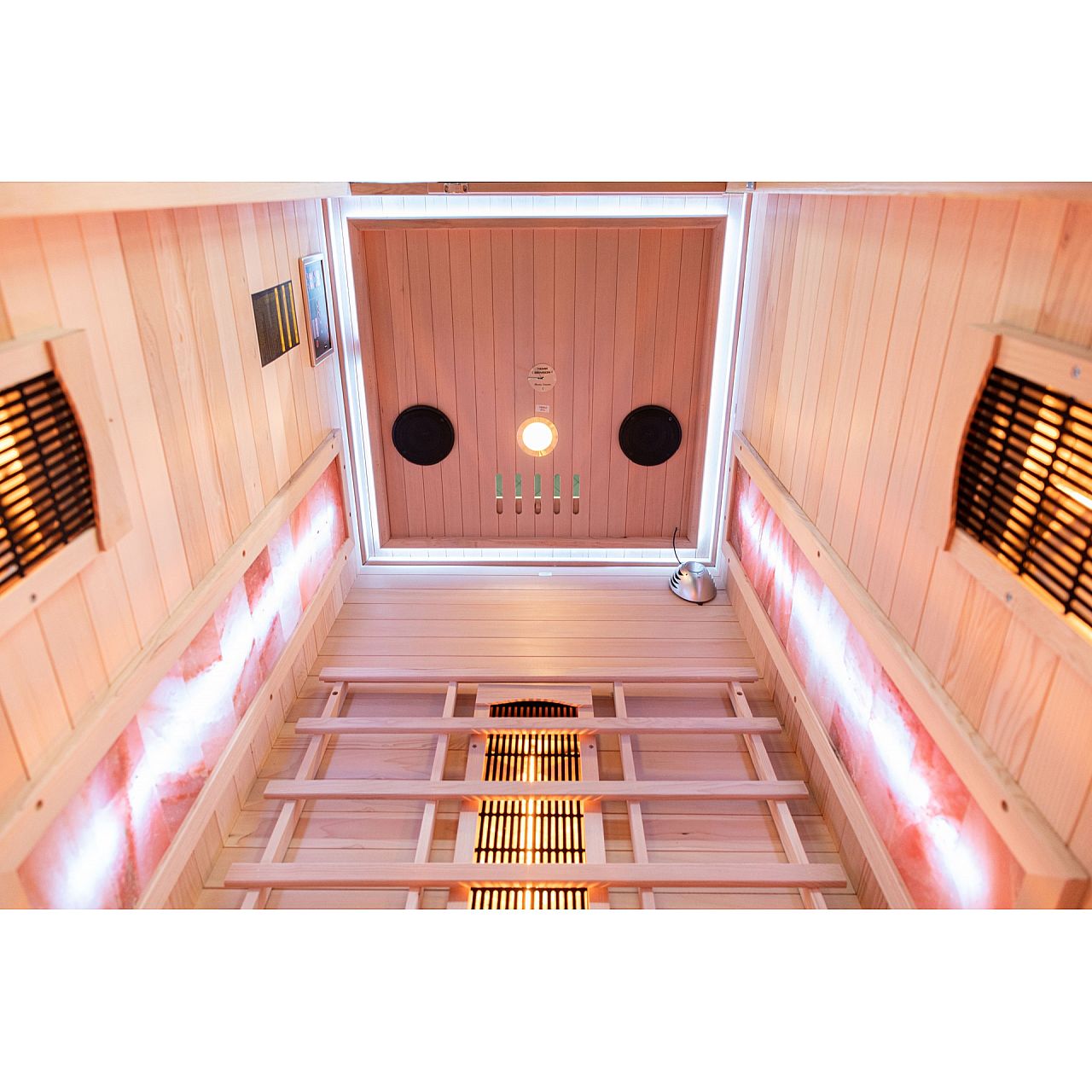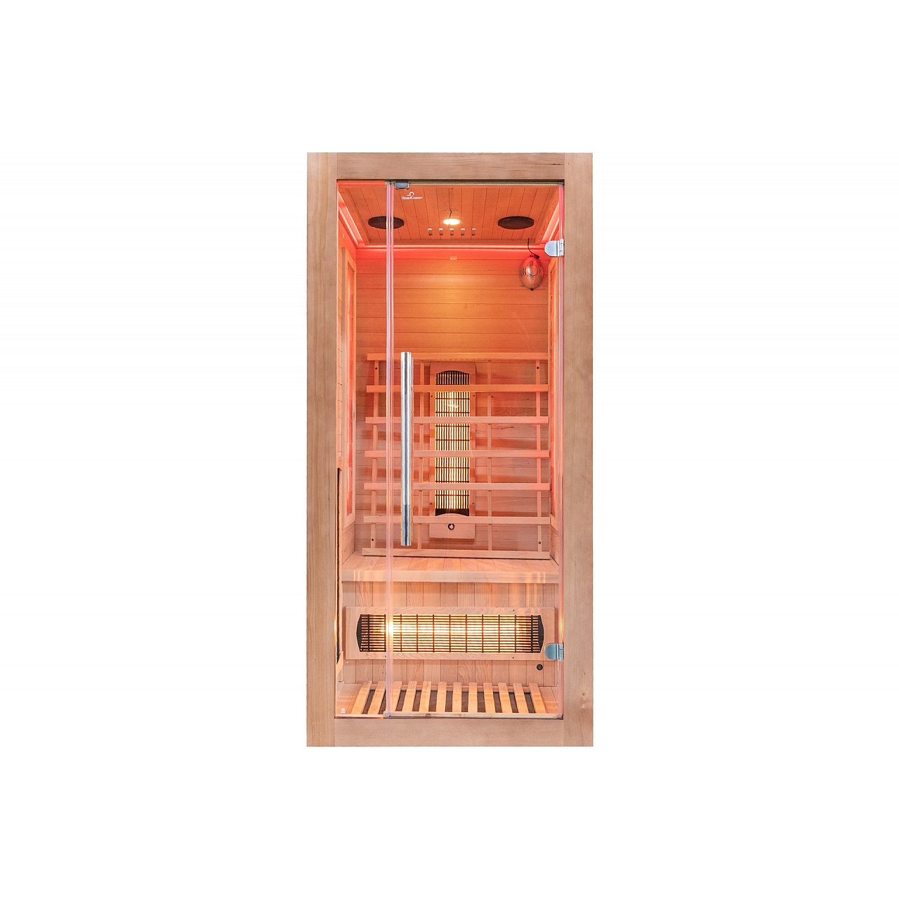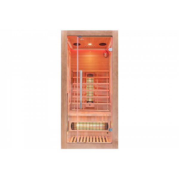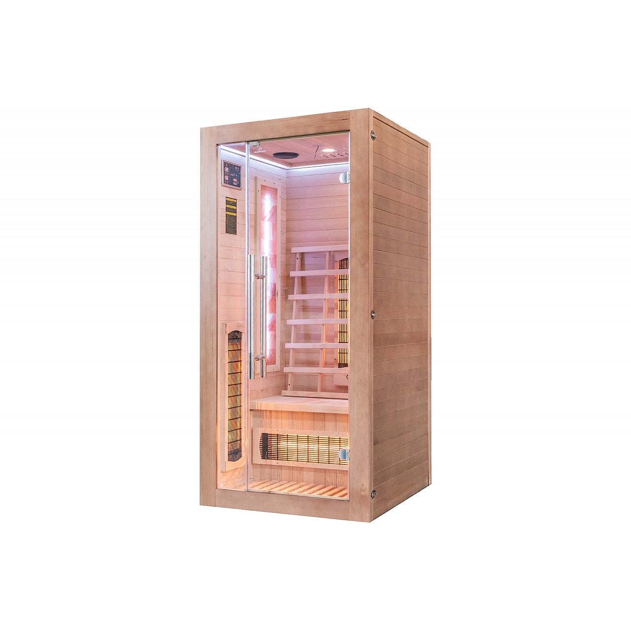 Інфрачервона сауна (інфрачервона, низькотемпературна) без пари і з низькою температурою повітря (до 60°C), де замість традиційних печей використовуються кварцові, керамічні або вугільні інфрачервоні обігрівачі. Кабіну з канадської ялиці можна встановити у ванній, спальні, вітальні або будь-якій іншій кімнаті. Для роботи достатньо звичайного джерела живлення 230В. Після ввімкнення сауна налаштована на заводі на 60 хвилин. Він має автоматичний вимикач, який запобігає випадковому залишанню сауни увімкненою на надто довгий час, що робить її безпечною у використанні. Радіатори захищені дерев'яними сітками.