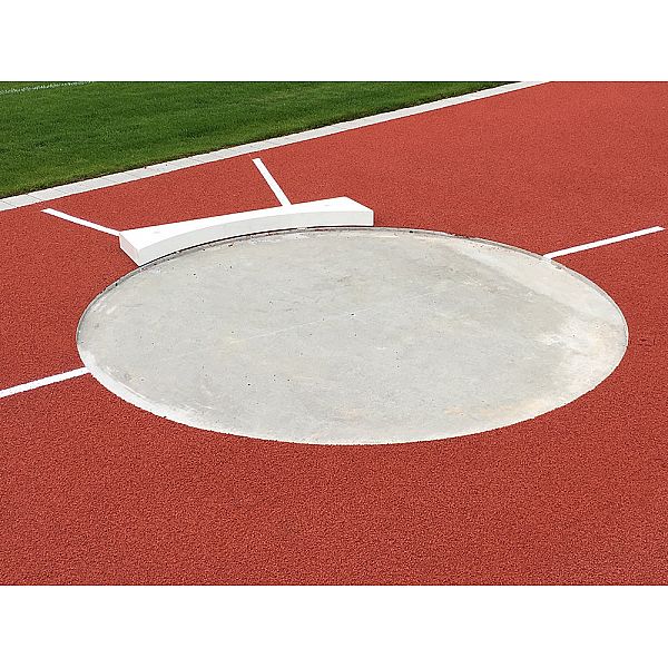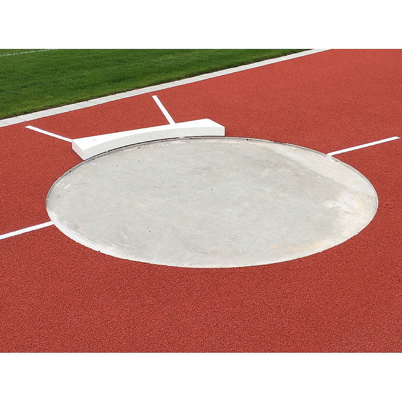 Круг для штовхання ядра, виготовлений із збірного бетону для полегшення встановлення. Виготовлений зі сталі, пофарбований порошковою фарбою в білий колір.