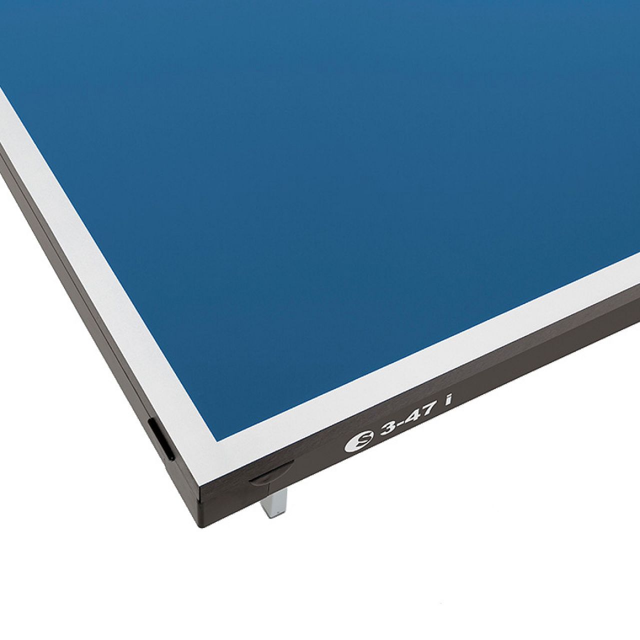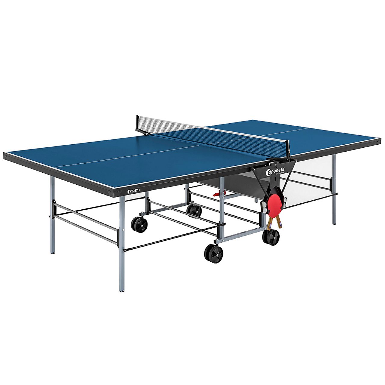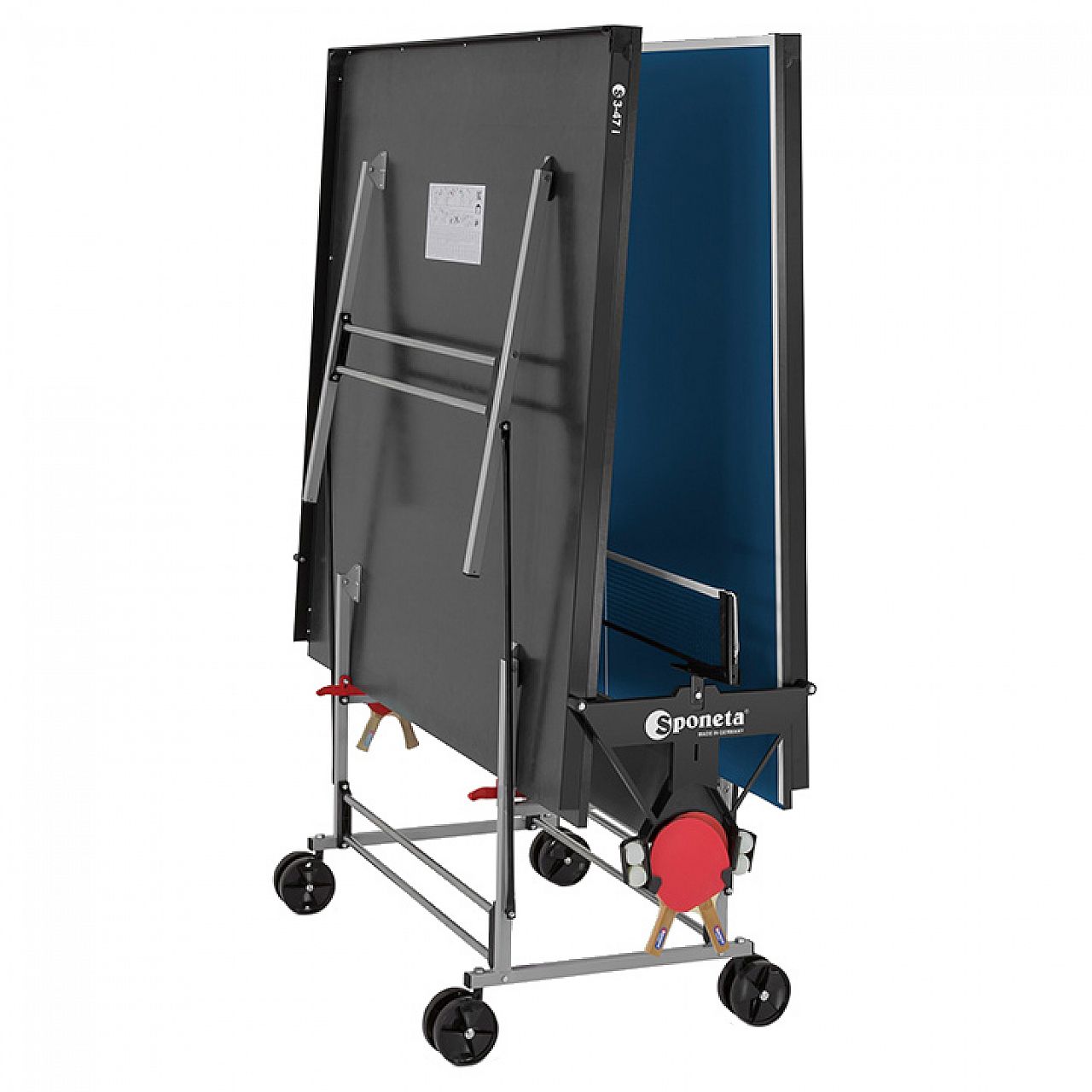 Стіл тенісний Sponeta S3-47i для використання в закритих приміщеннях. Це складна модель, що забезпечує зручність її зберігання та застосування в домашніх умовах. Ігрова поверхня виконана зі спеціально підготовленої панелі, товщиною 19 мм. Каркас виконаний з чорного металу, профілі квадратної форми 25х25 мм з покриттям порошковою фарбою.