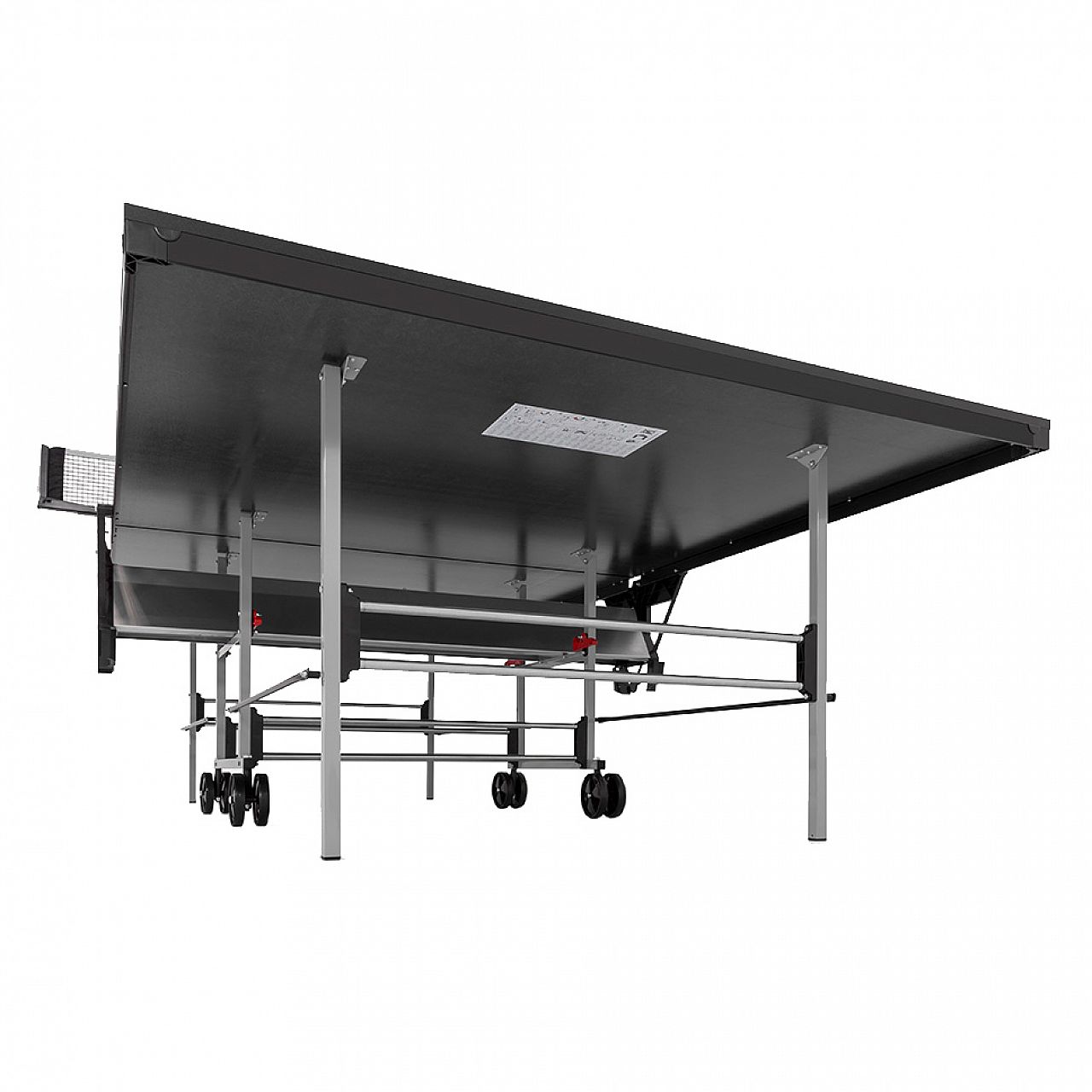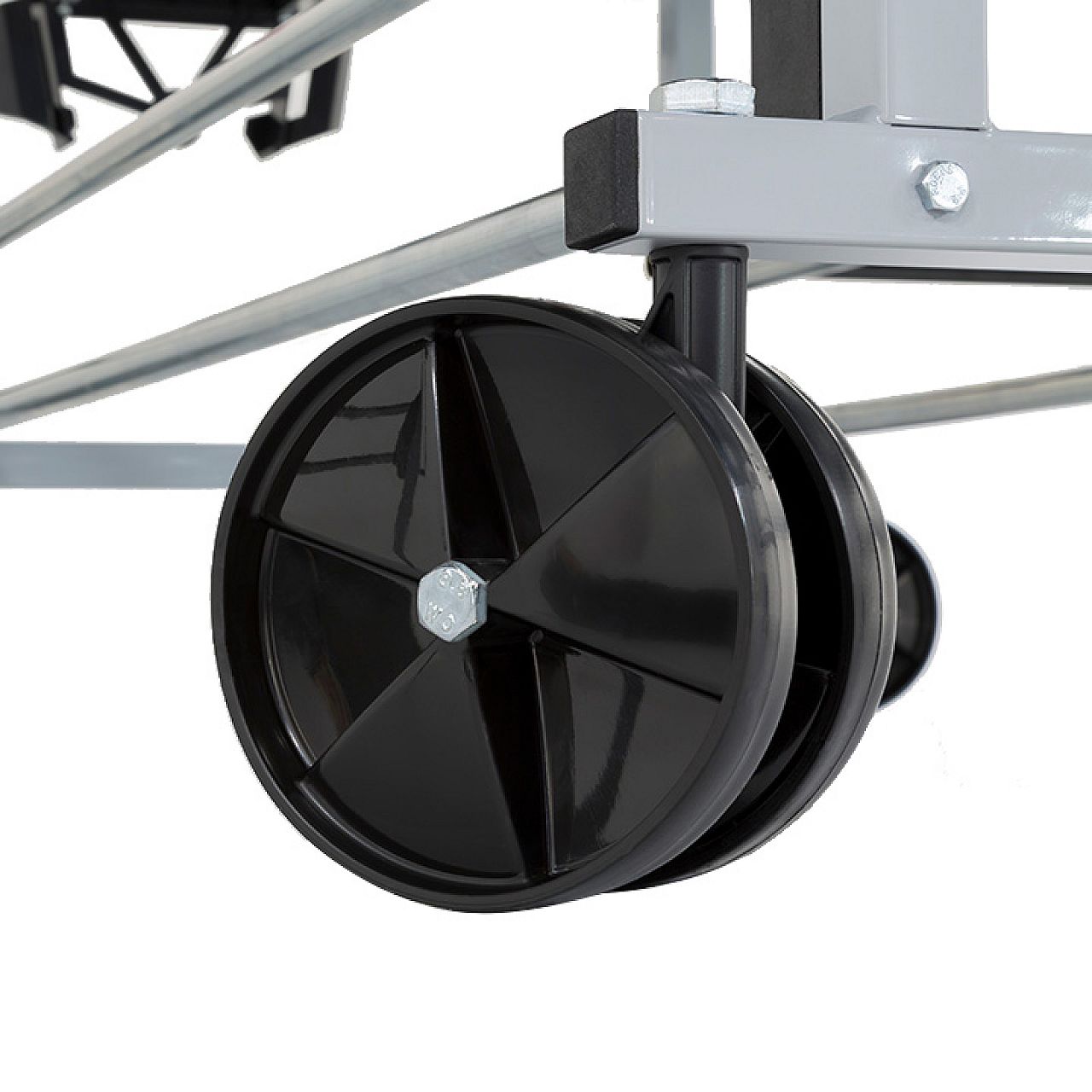 Стіл оснащений 4 транспортувань колесами діаметром 125 мм, що істотно полегшує транспортування обладнання при необхідності. У комплект також входить сітка розміром 180х15,2 см і утримувач для ракеток і м'ячів. Система гачків з механізмом замикання дозволить безпечно зберігати стіл в складеному стані.