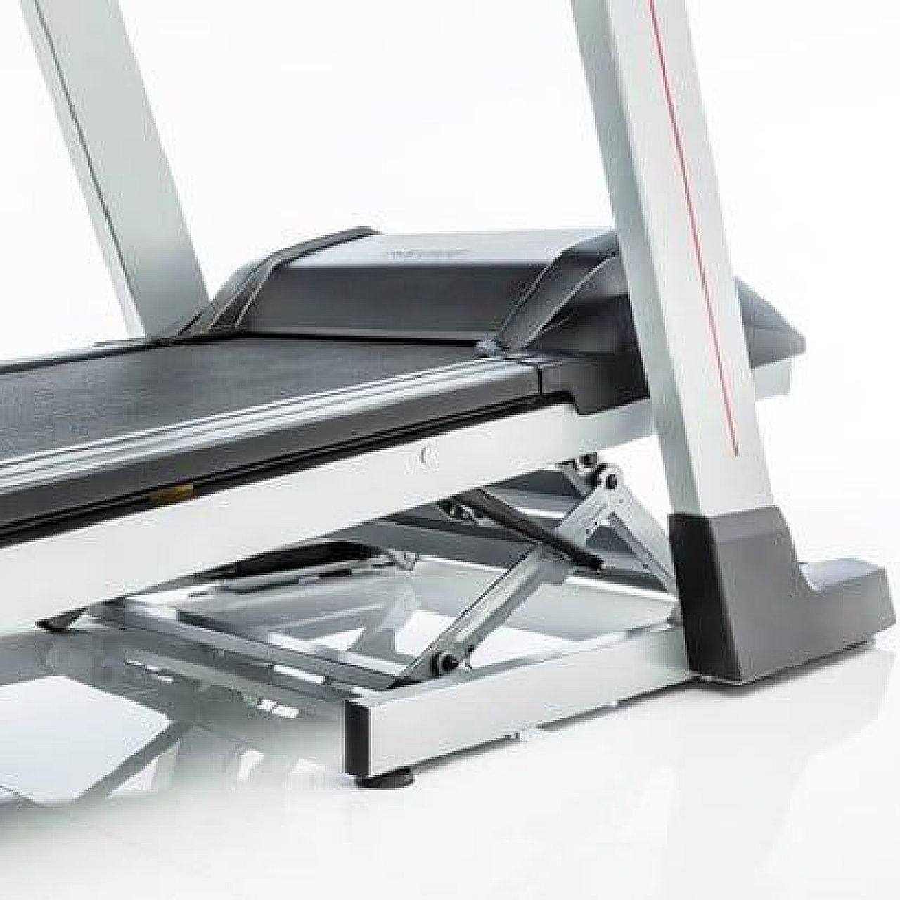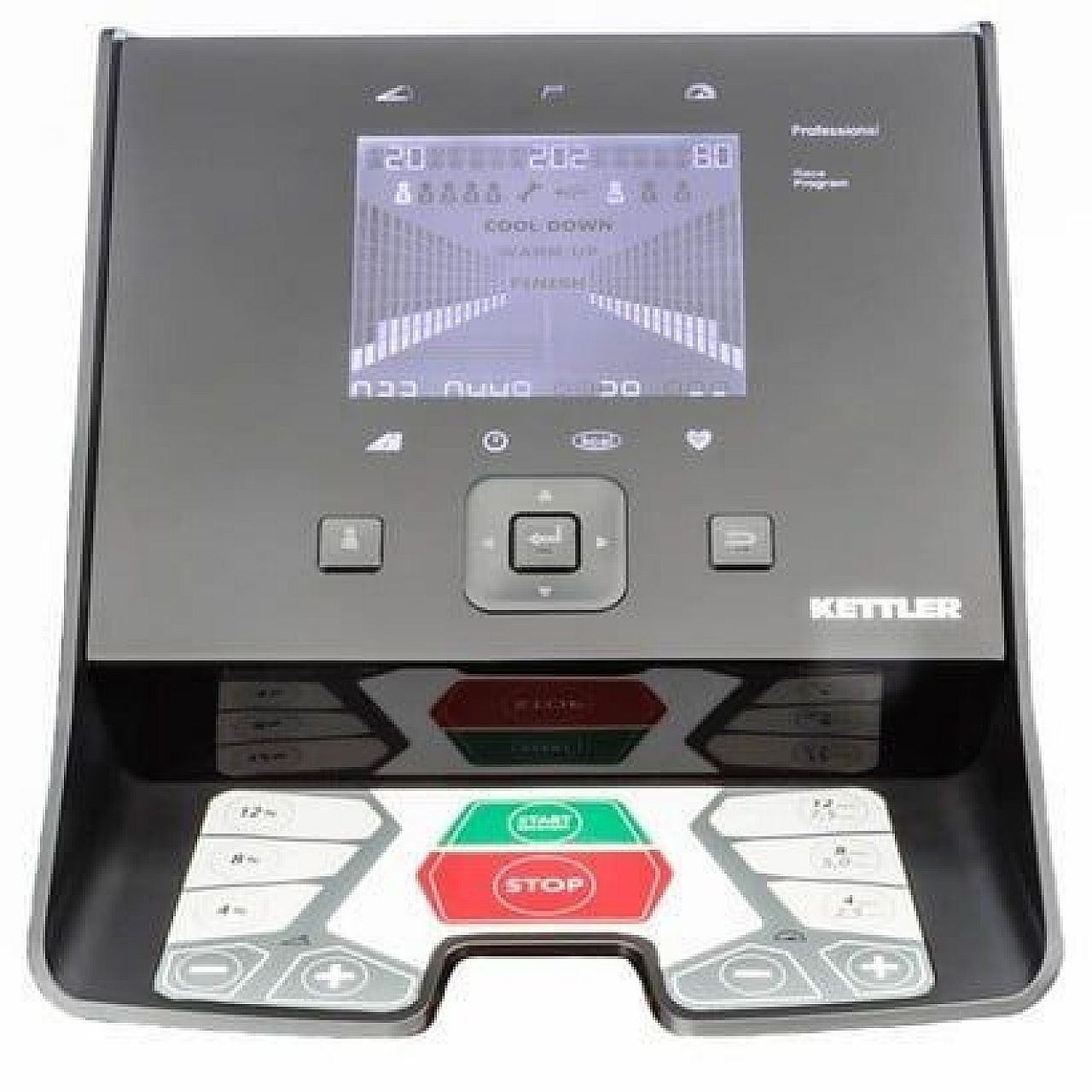 Kettler Track 9 - це бігова доріжка Топ-модель лінії Track від Кеттлер, що забезпечує найвищий рівень мотивації з різноманітністю варіантів тренування, що надаються. Вона дуже зручна у використанні, її бігове полотно має розміри 150х51 см, що забезпечує комфортну роботу навіть для високих людей. Інноваційна магнітна система демпфування вібрації забезпечує безпеку суглобів. Ця бігова доріжка дуже стійка та міцна. Її вантажопідйомність становить до 150 кг, а двигун під час максимальної роботи досягає 7,5 л.с., забезпечуючи тим самим швидкість до 20 км/год. Кут нахилу бігової доріжки керується електрично. Швидкість та кут нахилу можна також швидко змінити за допомогою розміщених на робочому столі кнопок для швидкого вибору.