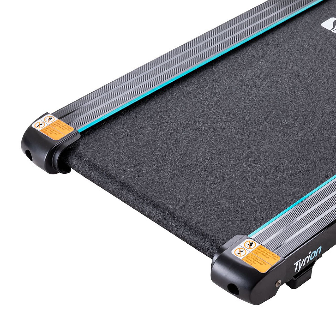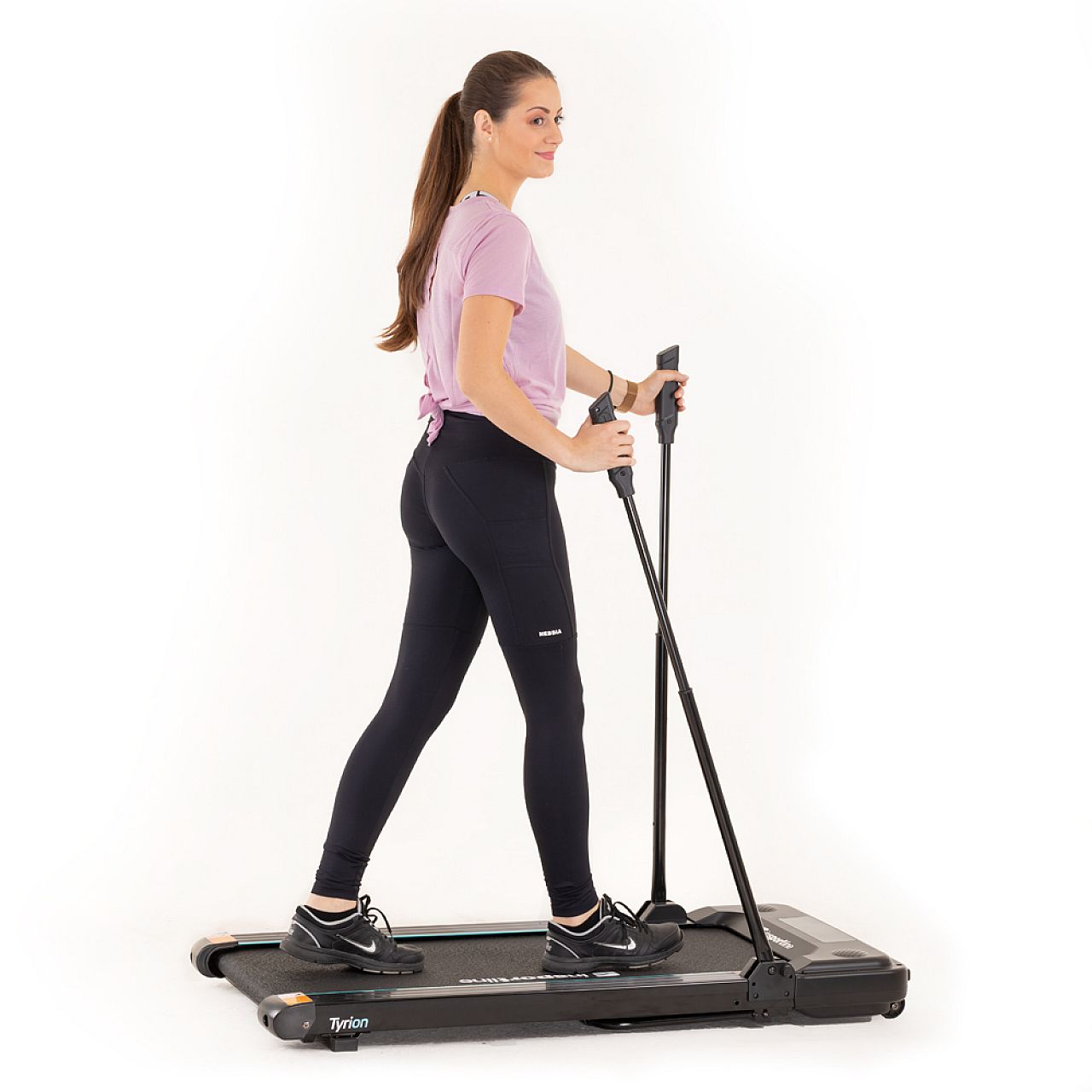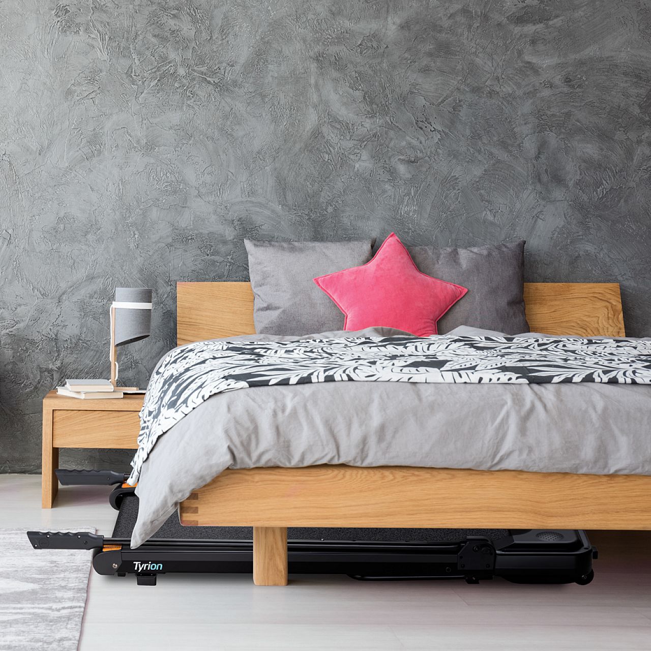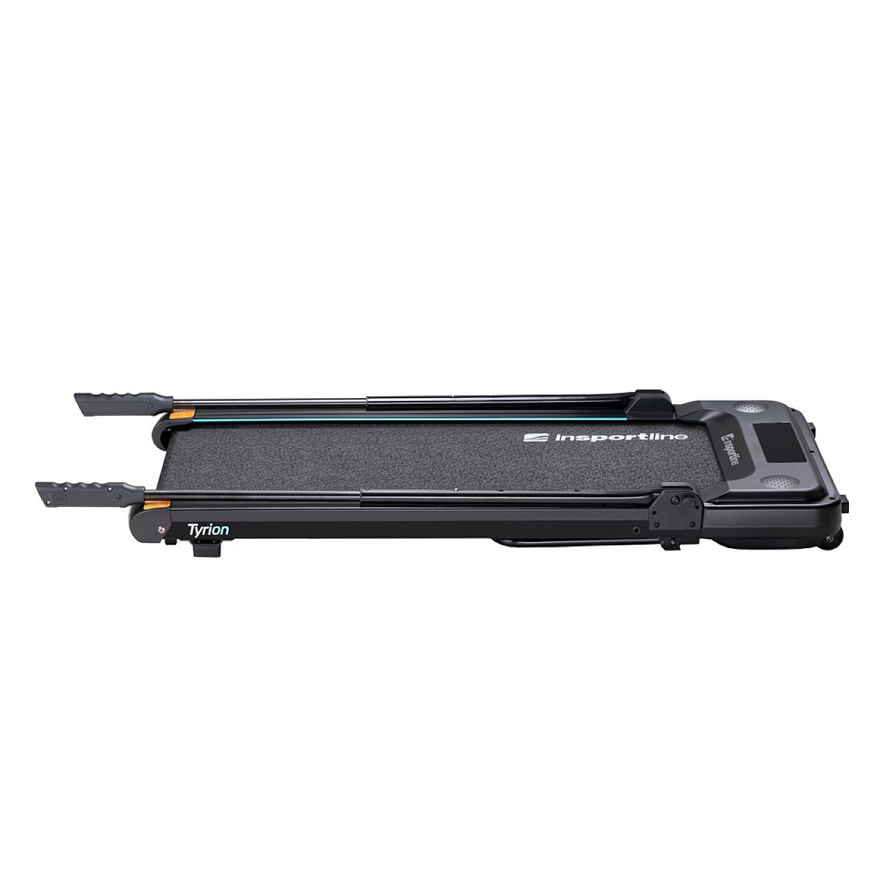 Бігова доріжка inSPORTline Tyrion унікальна у багатьох відношеннях. Крім зручної у зберіганні рами, він також має бічні ручки, які допомагають імітувати ходьбу з трекінговими палицями, що дозволяє більш ефективно тренувати верхню частину тіла. Бічні ручки регулюються по висоті ( три положення - 91, 103 та 111 см) . На правій ручці знаходиться панель керування із чотирма кнопками - пуск, зупинка та встановлення швидкості. Оскільки ви можете забрати бігову доріжку під ліжком або за шафою, вона ідеально підходить для домашнього використання. У складеному стані його висота всього 13 сантиметрів ! Завдяки зручній у зберіганні рамі бігова доріжка inSPORTline Tyrion ідеально підходить для тих, хто не має вільного місця в будинку.