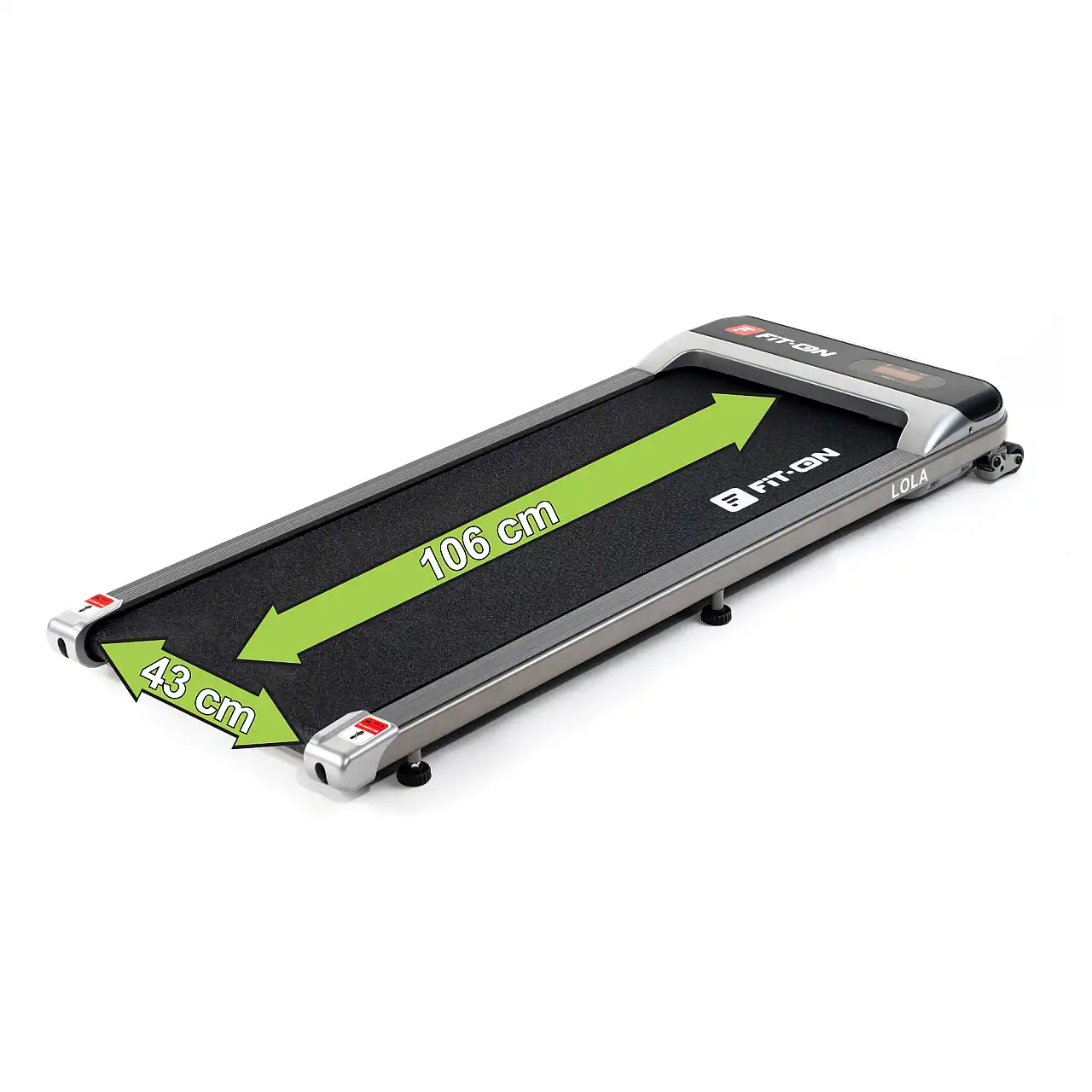 Оснащена двигуном потужністю 1,75 к.с. (пікова — 2,25 к.с.), Fit-On Lola забезпечує стабільну роботу при будь-якому навантаженні. Бігове полотно 106 × 43 см створює комфортні умови як для ходьби, так і для легкого бігу, а міцна конструкція витримує до 100 кг.