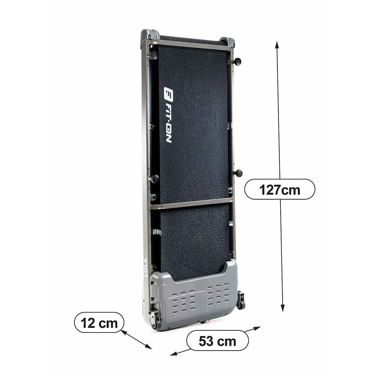 Доріжка Fit-On Lola має складану конструкцію, завдяки якій легко зберігається навіть у невеликих квартирах. Вона швидко складається, займає мінімум місця і легко переміщується завдяки вбудованим роликам.