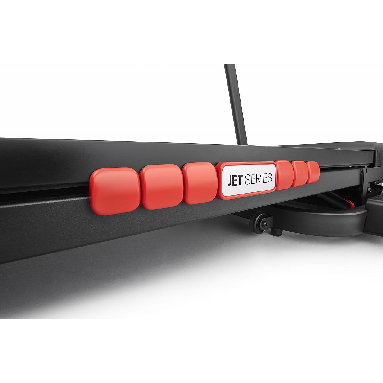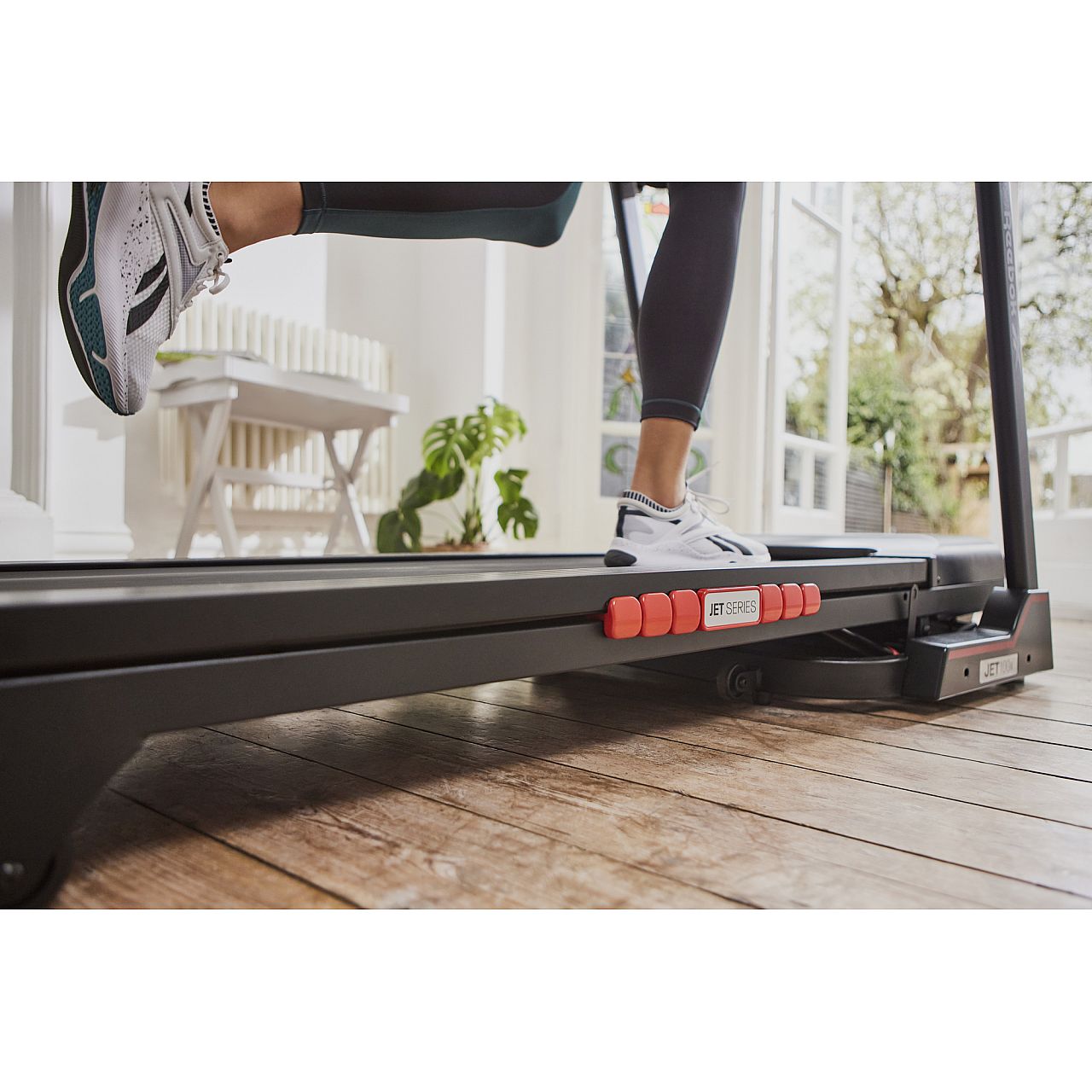 З 24 встановленими фітнес-програмами, індивідуальними та 3 цільовими програмами, Jet 100x має безліч варіантів, щоб допомогти вам зберегти мотивацію та гарантувати, що ви зможете досягти поставлених цілей у фітнесі. Вбудована консоль бігової доріжки з 5-віконним світлодіодним дисплеєм відображає докладну інформацію про ваші тренування. На дисплеї можна відстежувати швидкість, час, відстань, калорії, кроки та рівень нахилу, а також частоту пульсу у реальному часі за допомогою вбудованих ручних датчиків.