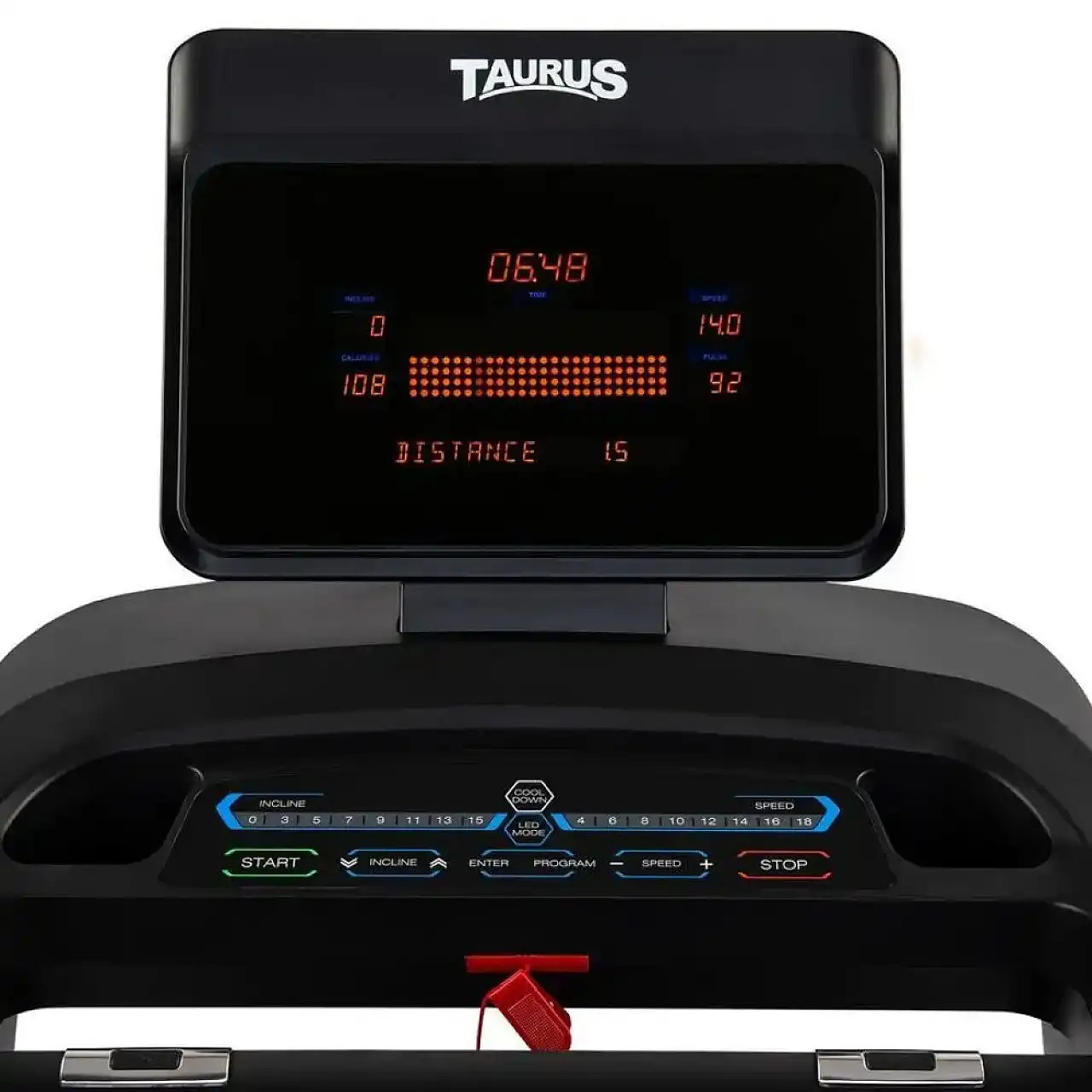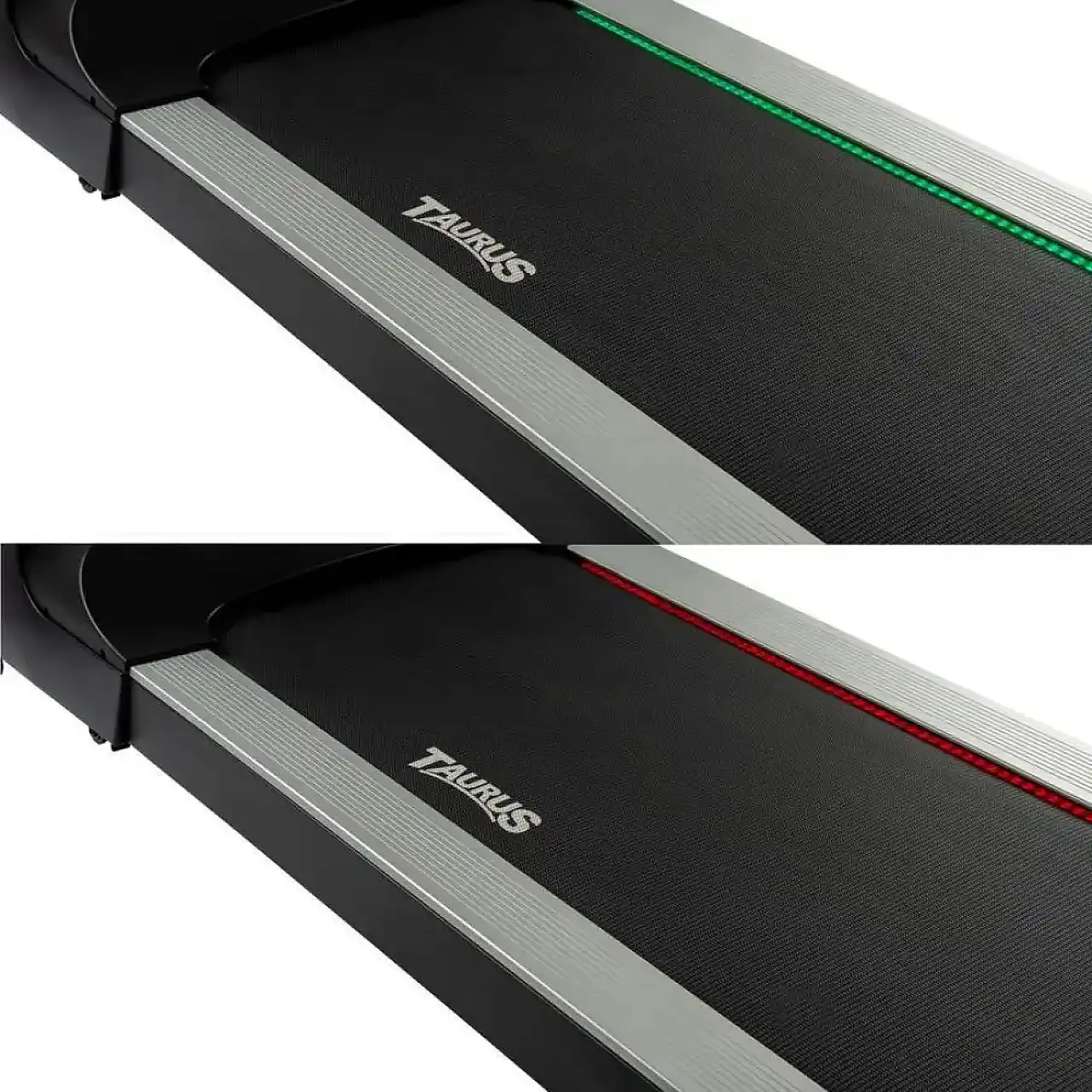 Бігова доріжка Taurus T10.3 Pro має одну з найбільших бігових поверхонь на ринку, а розміри 160 x 56 см забезпечують достатній простір і комфорт для високих швидкостей бігу навіть для великих людей. Поверхня бігового полотна має дві алюмінієві смужки з обох боків. Вони особливо стійкі та виглядають дуже добре. Для більшої безпеки на проступях встановлені спеціальні протиковзкі покриття.
