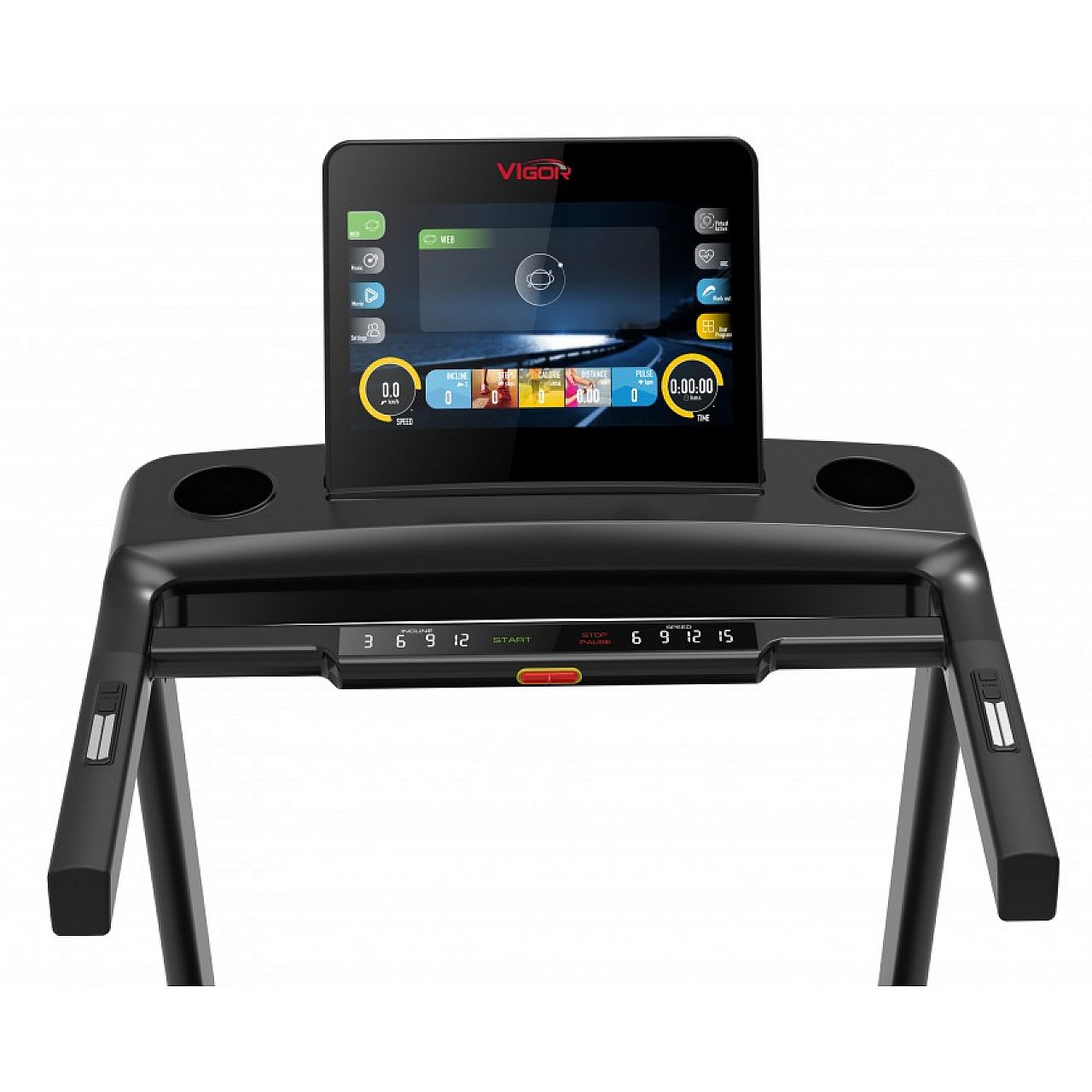 15.6” TFT дисплей, налаштування, параметри: час навчання, подолана дистанція, швидкість, кількість кроків, витрачені калорії, пульс
