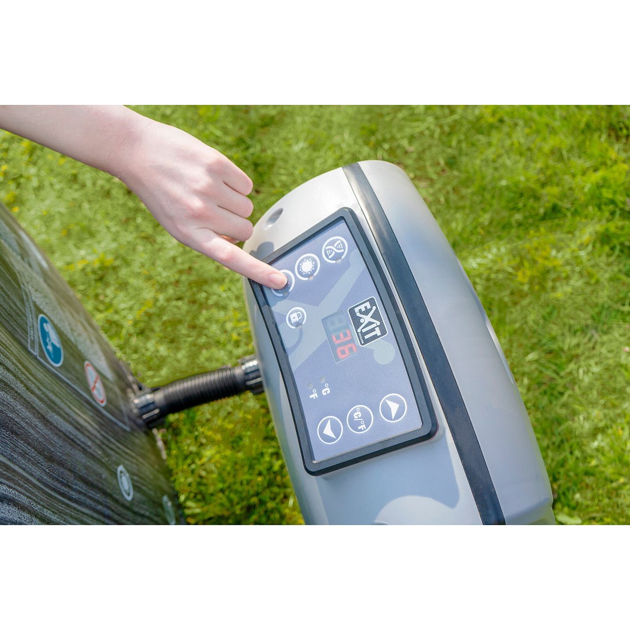 СПА Басейн надувний EXIT Deluxe практично не вимагає обслуговування завдяки насосу, який очищає воду і одночасно нагріває її до 40 градусів Цельсія. Таким чином, ви можете насолоджуватися теплою водою в цьому вуличному джакузі навіть в холодні дні. За допомогою цифрової панелі управління можна легко встановити температуру і активувати 140 повітряних форсунок, щоб забезпечити належні бульбашки. Цей басейн джакузі можна доповнити практичними аксесуарами - зручний підголівник з підстаканниками для напоїв і атмосферне світлодіодне освітлення.