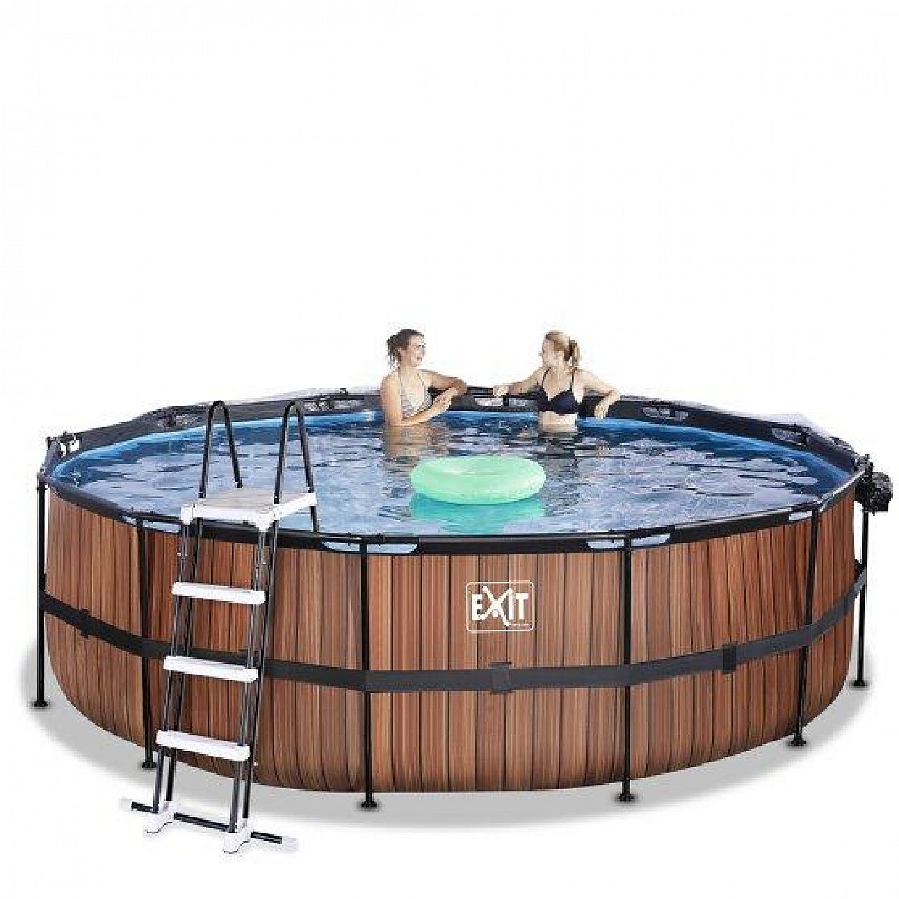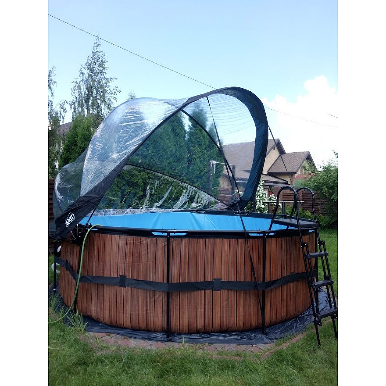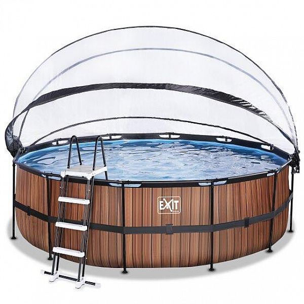 Басейн круглий з куполом EXIT дерево 450х122 см (фільтр картридж) виглядає лаконічно і елегантно. З зовнішньої сторони - тканина з візерунком у вигляді дерев'яної стіни, що зробить його розміщення в саду, на дачі або у дворі будинку особливо естетичним.