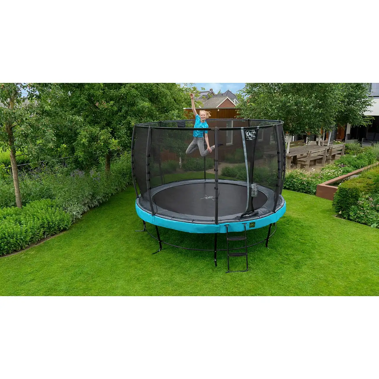 Батут EXIT Elegant Premium 366 cm blue з сіткою безпеки Deluxe для дітей і дорослих - це високоякісний круглий батут, продукт найвищого класу, кращий з серії батутів Elegant з захистом на пружинах сірого кольору і блакитною спідницею. Він безпечний, красивий, дуже зручний, має супер міцну раму і легко збирається.
