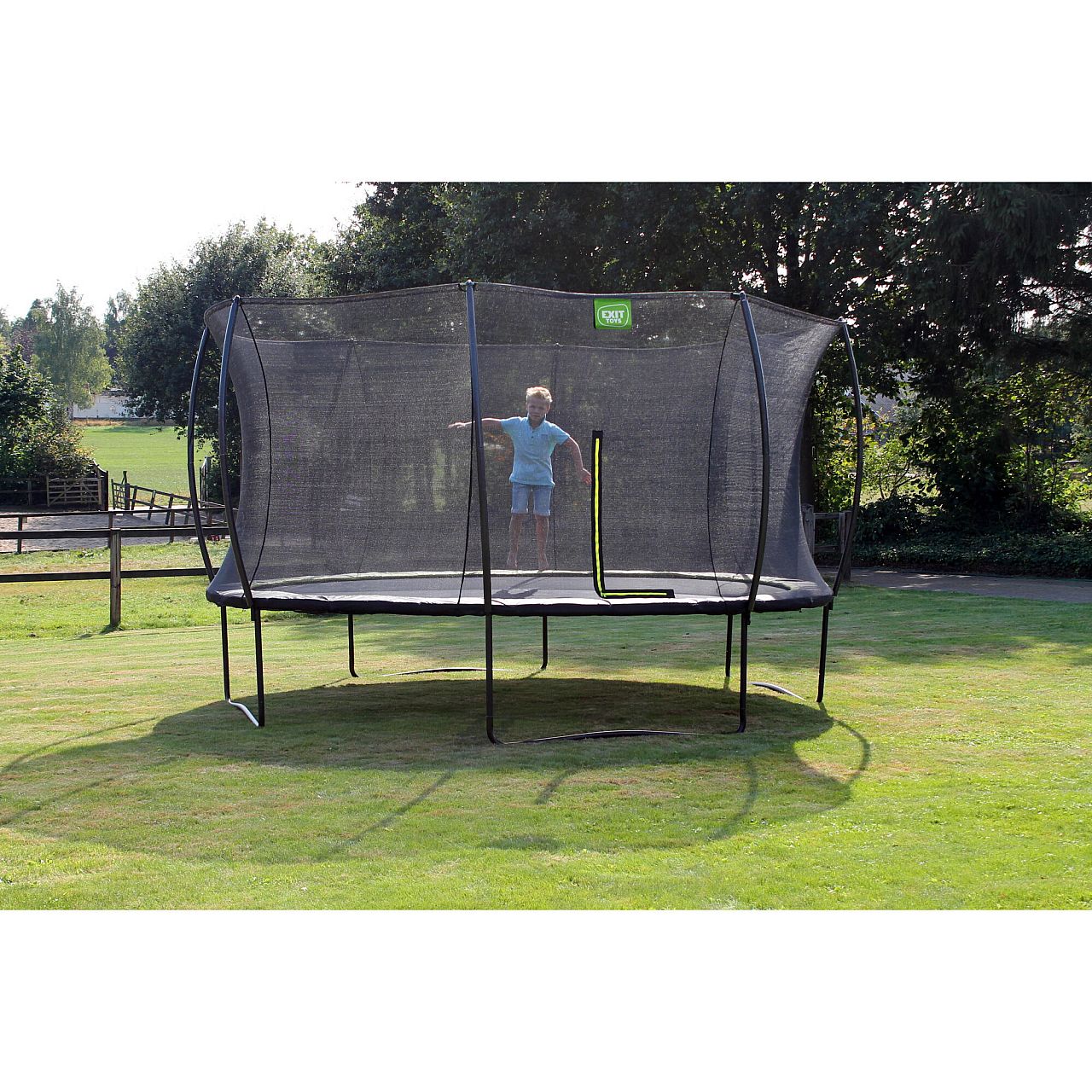 Батут Exit Silhouette 427 чорний - красивий, надійний, довговічний, сучасний і прекрасно розроблений, без сумнівів, буде чудово виглядати в будь-якому саду або дворі будинку. Конструкція досить стійка і поставляється в комплекті з захисною сіткою, яка оснащена яскравим флуоресцентної зеленої блискавкою, щоб ви могли відразу побачити, чи правильно вона закрита. Батут має контрастний чорний матовий колір з включеннями яскраво-зелених акцентів, що робить його елегантним і привабливим.