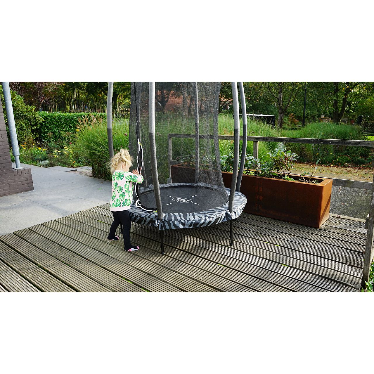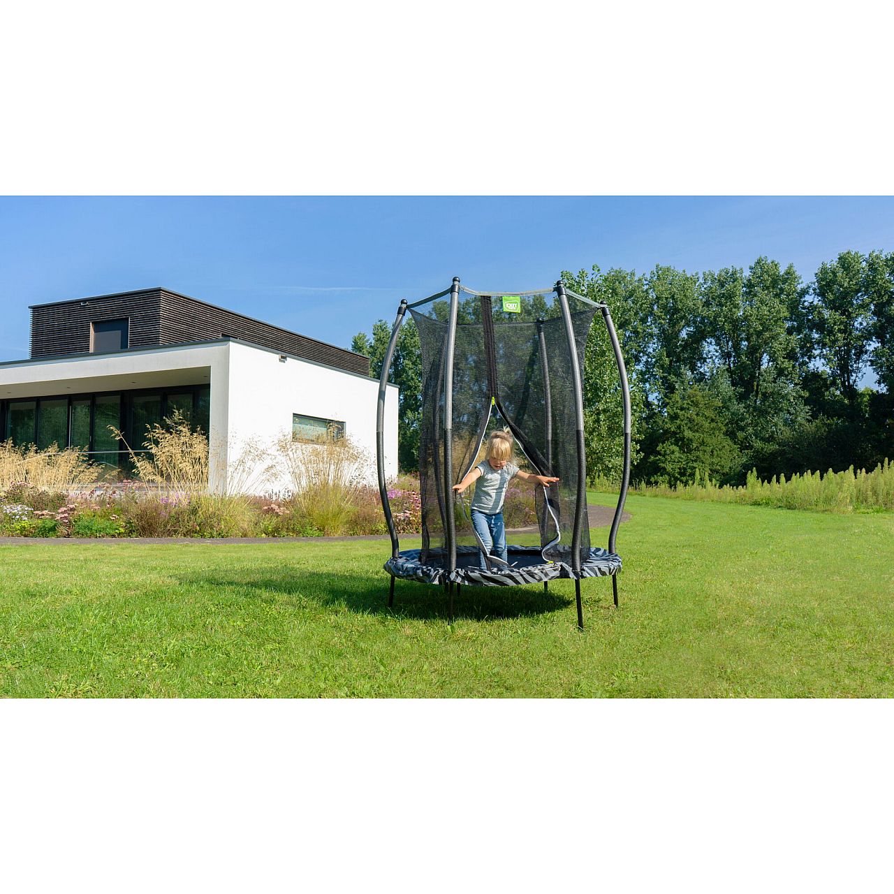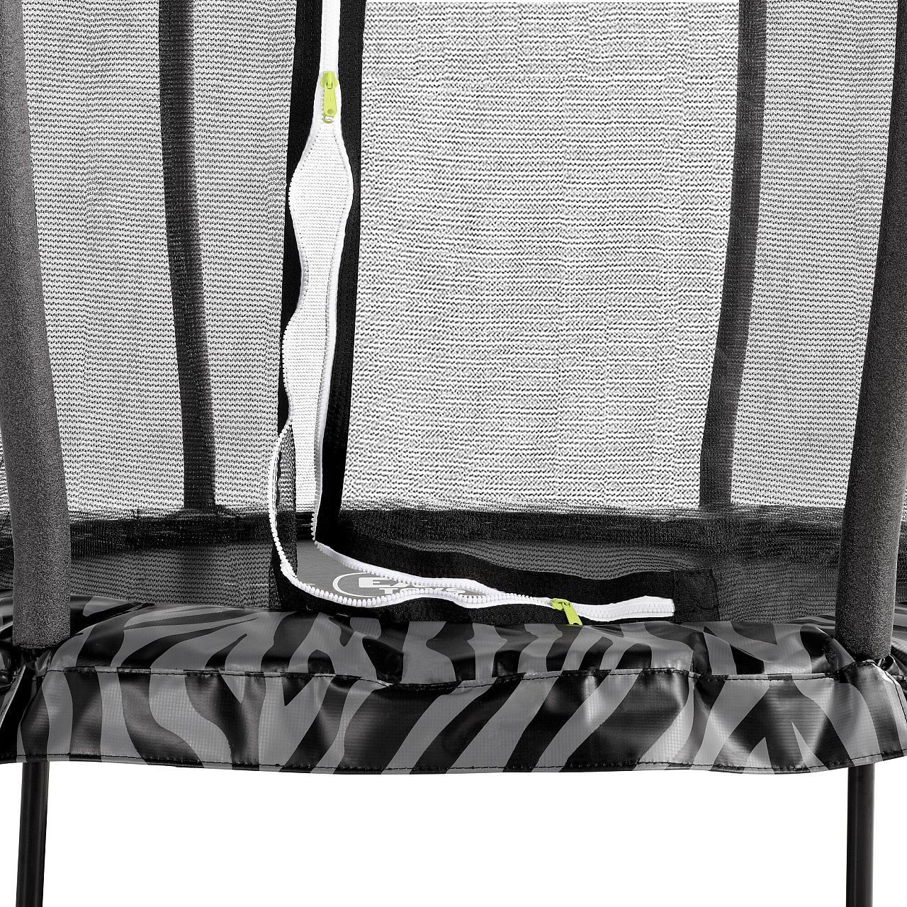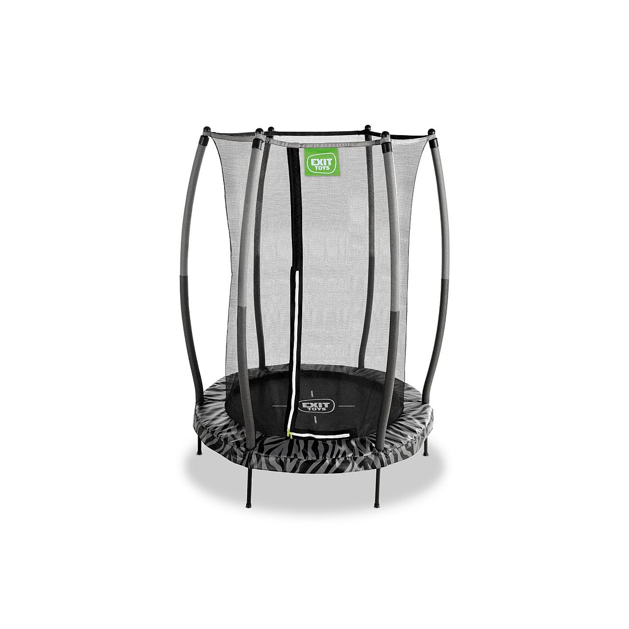 Батут дитячий EXIT Tiggy 140 см сірий - міні-батут для дітей від двох до шести років. Це компактний круглий батут з внутрішньої сіткою безпеки, який має захисний мат сіро-чорного кольору з леопардовим малюнком. Батут розроблений спеціально для малюків, він не високий, від землі його висота всього 34 см, щоб маленьким дітям було зручно залазити на нього.