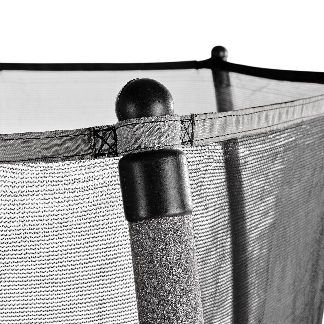 Замість пружин , які маються у великих батутах, оснащений гумками для забезпечення більш плавного відскоку і м'якої посадки. А в разі невдалого стрибка захисна сітка не дозволить стрибаючою впасти на підлогу. Сітка надійно прикріплена до захисному покриттю, щоб уникнути попадання рук і ніг між гумками.
