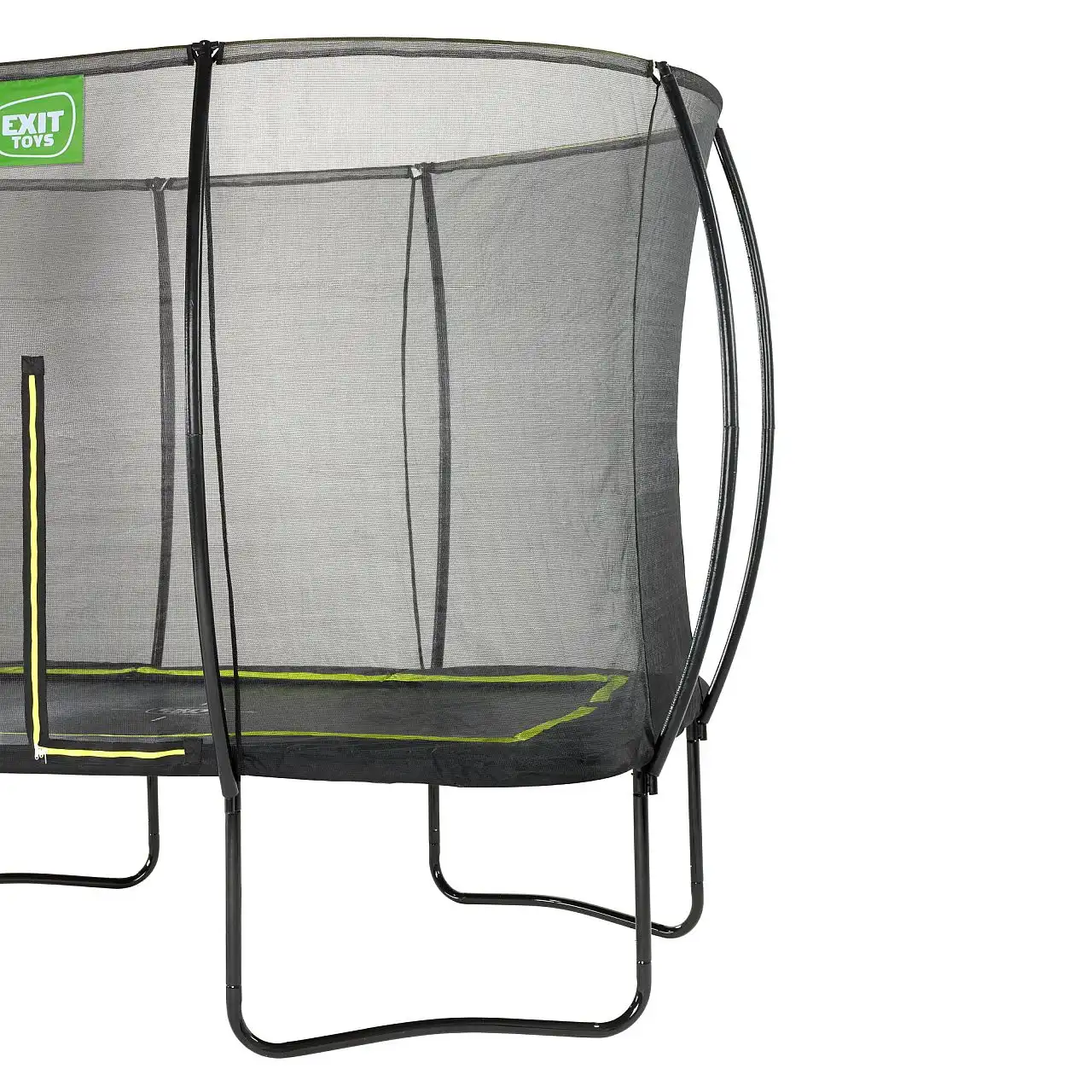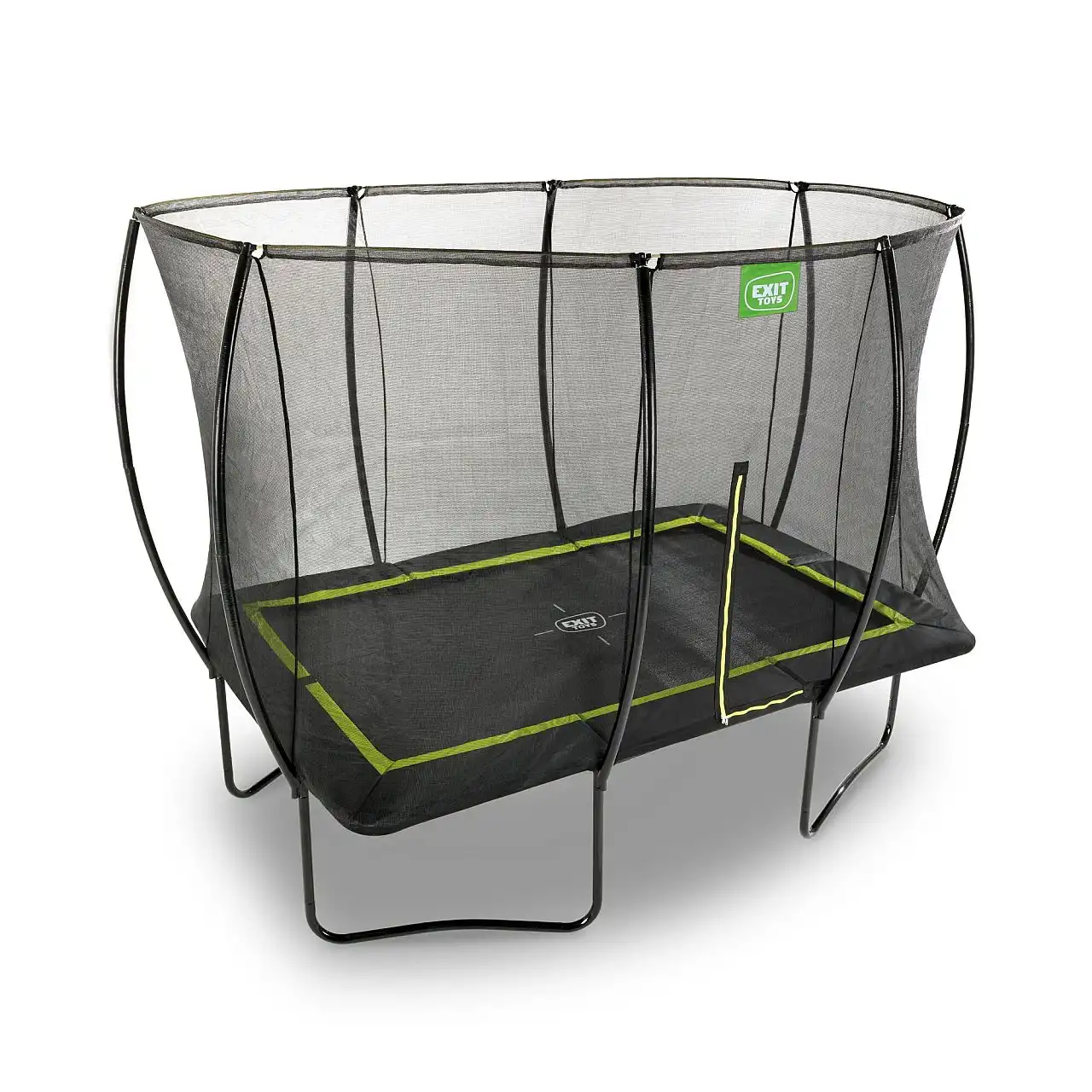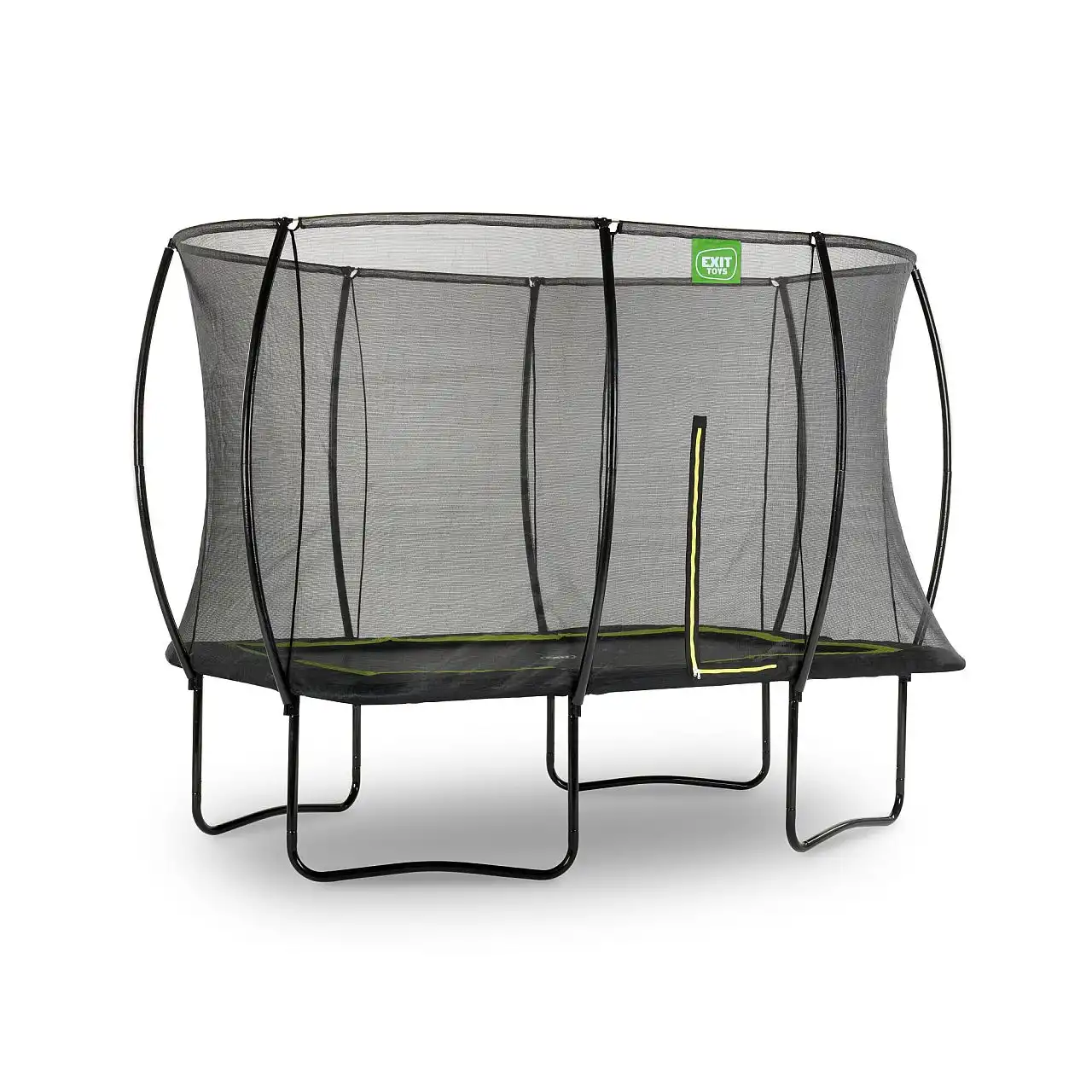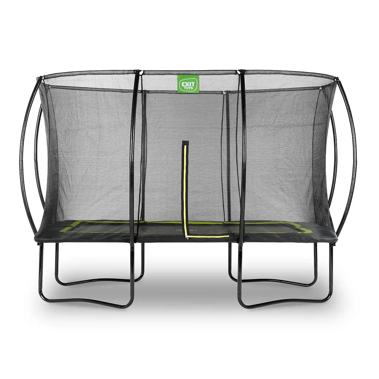 Батут EXIT Silhouette 244х366 см прямокутний чорний на ніжках. Красивий, надійний, довговічний, сучасний і прекрасно розроблений, без сумнівів, буде чудово виглядати в будь-якому саду або дворі будинку. Конструкція досить стійка і поставляється в комплекті з захисною сіткою, яка зручно відкривається з допомогою флуоресцентної блискавки зеленого кольору, так що Ви відразу зможете побачити закрита блискавка належним чином. Батут має контрастний чорний матовий колір з включеннями яскраво-зелених акцентів, що робить його елегантним і привабливим.