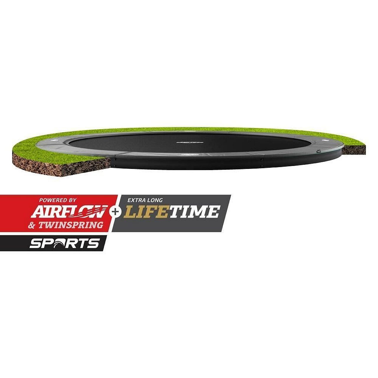 Серія батутів FlatGround Elite відноситься до преміум класу, що означає найвищий комфорт стрибків у поєднанні з найкращою міцністю та безпекою. Батут встановлюється в один рівень із землею, не порушуючи гармонії вашого саду та не вимагаючи зайвих зусиль, щоб забратися на нього. Рама батутів оброблена методом оцинкування та покрита порошковою фарбою чорного кольору, що забезпечує додатковий захист від корозії. Технологія стрибкового покриття Berg Airflow дозволяє пропускати на 50% більше повітря в порівнянні зі стандартним покриттям. Подовжені пружини TwinSpring Gold дозволяють високо стрибати навіть за слабкого відштовхування.