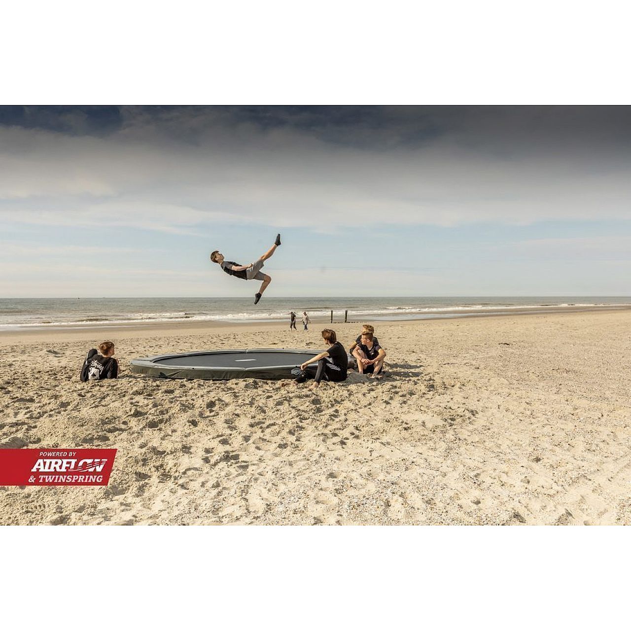 Батути BERG серії InGround Champion встановлююсь у ґрунт на опори, не порушуючи гармонії вашого саду та не вимагаючи зайвих зусиль, щоб забратися на нього. Подовжені пружини TwinSpring Gold, встановлені під кутом, гарантують додаткову легкість стрибків. Унікальна технологія стрибкового покриття Airflow дозволяє пропускати на 50% більше повітря, ніж стандартне полотно.