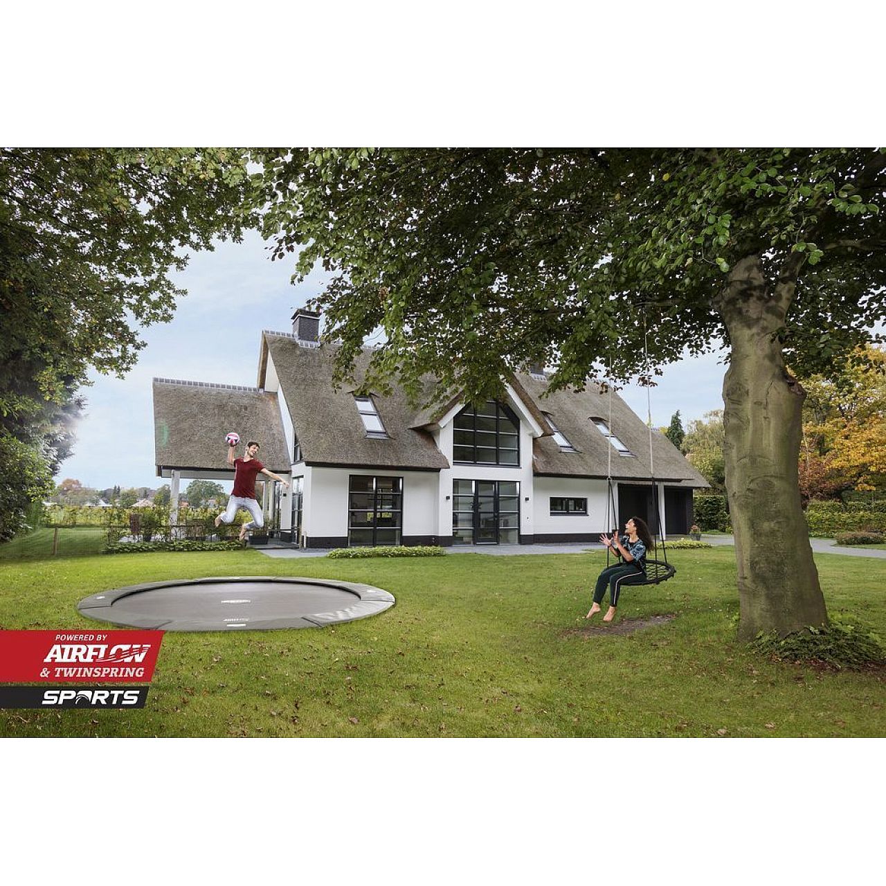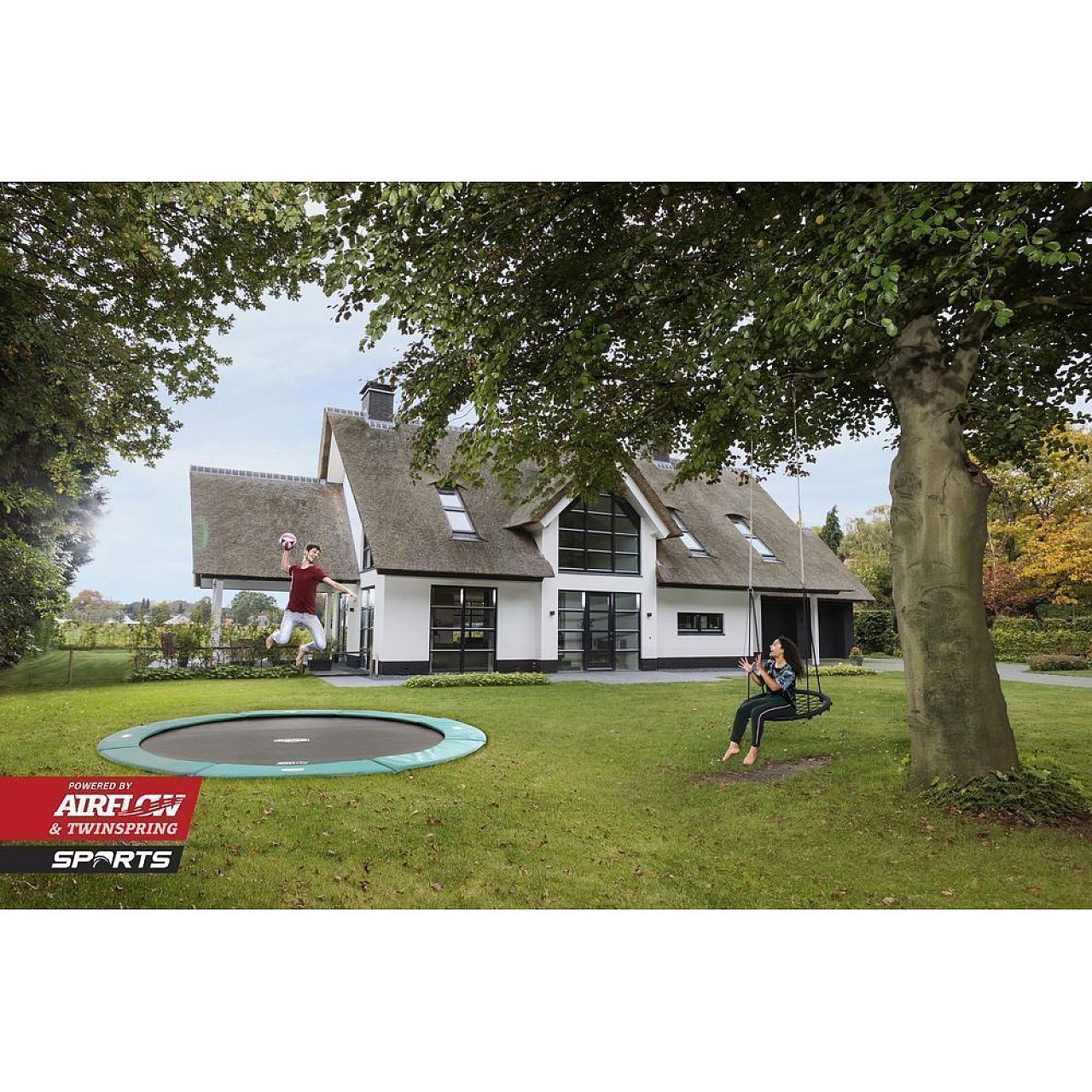 Батути BERG серії FlatGround Champion прослужать вам довгі роки завдяки винятковій якості, а також стійкій до корозії оцинкованій рамі з порошковим покриттям. Батут встановлюється в один рівень із землею, не порушуючи гармонії вашого саду та не вимагаючи зайвих зусиль, щоб забратися на нього. Подовжені пружини TwinSpring Gold, встановлені під кутом, гарантують додаткову легкість стрибків. Унікальна технологія стрибкового покриття Airflow дозволяє пропускати на 50% більше повітря, ніж стандартне полотно.