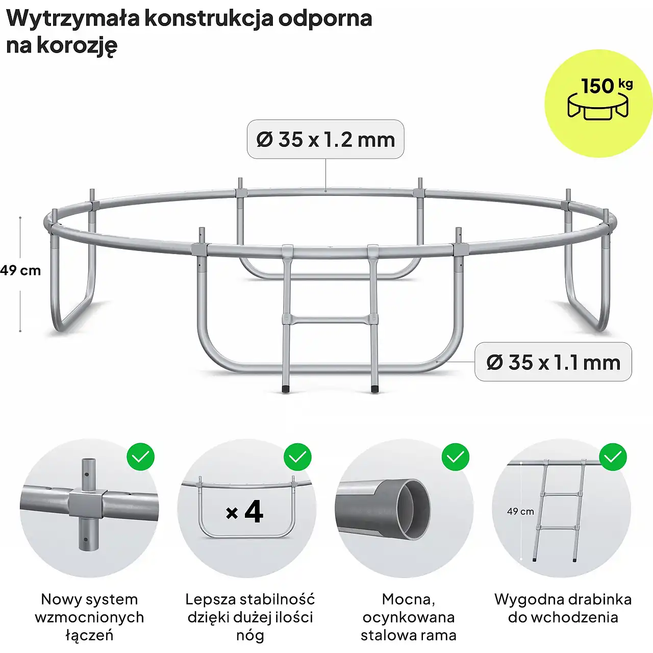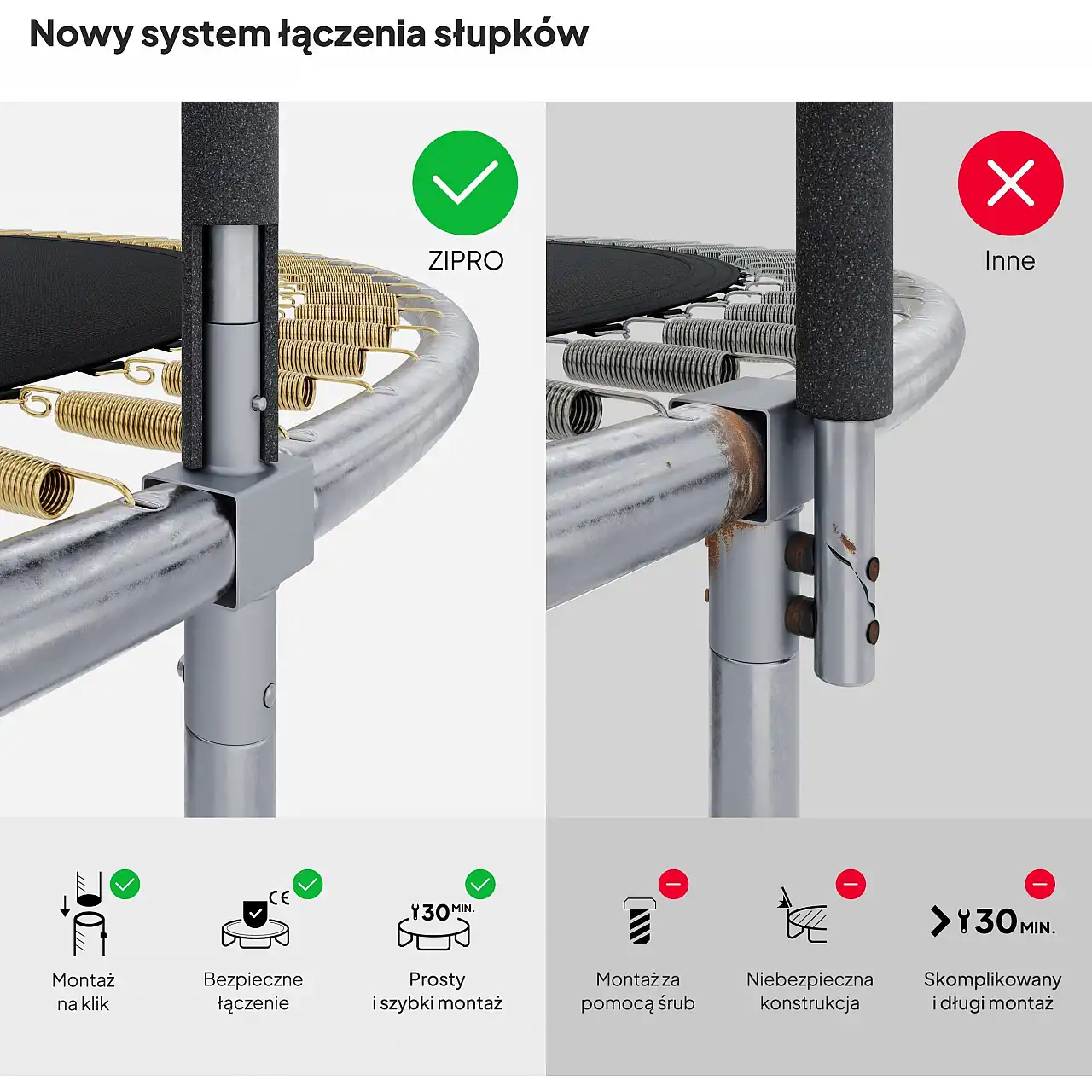 Конструкція батута ЗИПРО проста і надійна. Його розборка нескладна, як і збірка після закінчення прижкового сезону - з нею легко впорається одна людина. Спеціалізація цинкового покриття забезпечує стійкість конструкцій і корозії вторинних елементів, таких як батут, набір і покриття, стійкі до сонячного світла і вологи.