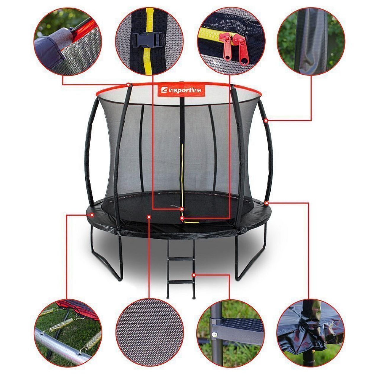 Пружини, що утримують батут, заховані під захисним кожухом, а сітчасті стійки набиті поролоновими рукавами. Сходи протиковзкі дозволяють входити на батут безпечно, вхід забезпечений не тільки з застібкою - блискавкою , але і пряжками. Завдяки діаметру 244 см цей батут впишеться у ваш сад. Якщо ви хочете розважити невгамовних членів сім'ї (у тому числі дорослих), батут inSPORTline Flea 244 см - ваш вибір !