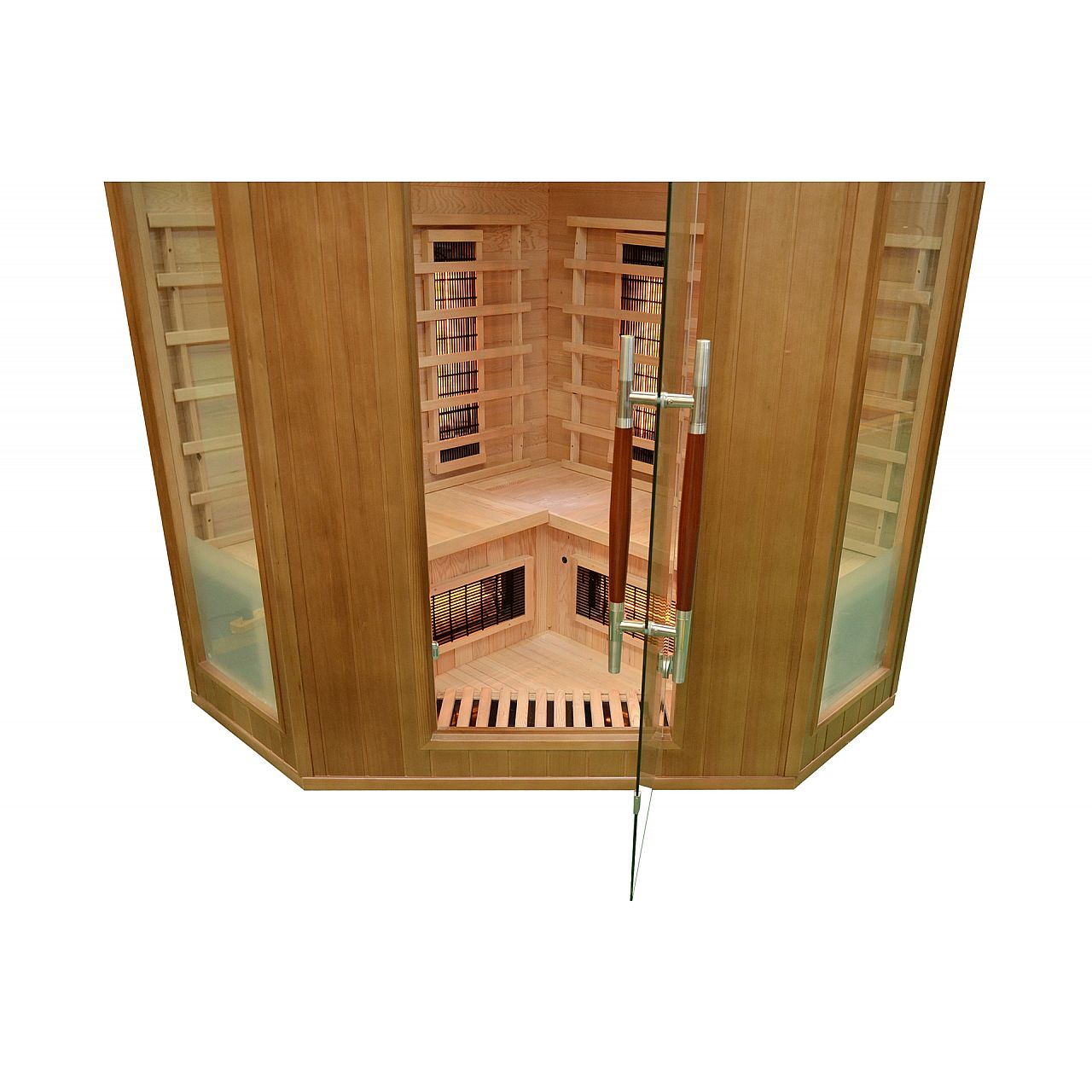 Інфрачервона сауна (інфрачервона, низькотемпературна) без пари і з низькою температурою повітря (до 60°C), де замість традиційних печей використовуються кварцові, керамічні або вугільні інфрачервоні обігрівачі. Кабіну з канадської ялиці можна встановити у ванній, спальні, вітальні або будь-якій іншій кімнаті. Для роботи достатньо звичайного джерела живлення 230В. Після ввімкнення сауна налаштована на заводі на 60 хвилин. Він має автоматичний вимикач, який запобігає випадковому залишанню сауни увімкненою на надто довгий час, що робить її безпечною у використанні. Радіатори захищені дерев'яними сітками.