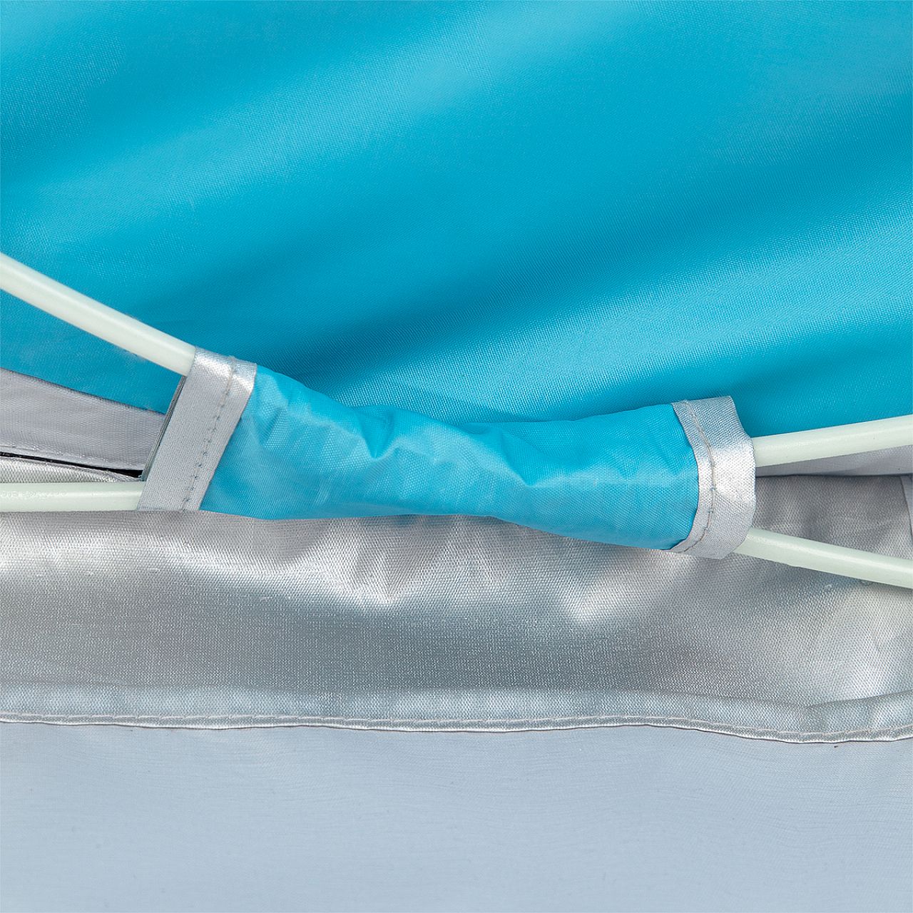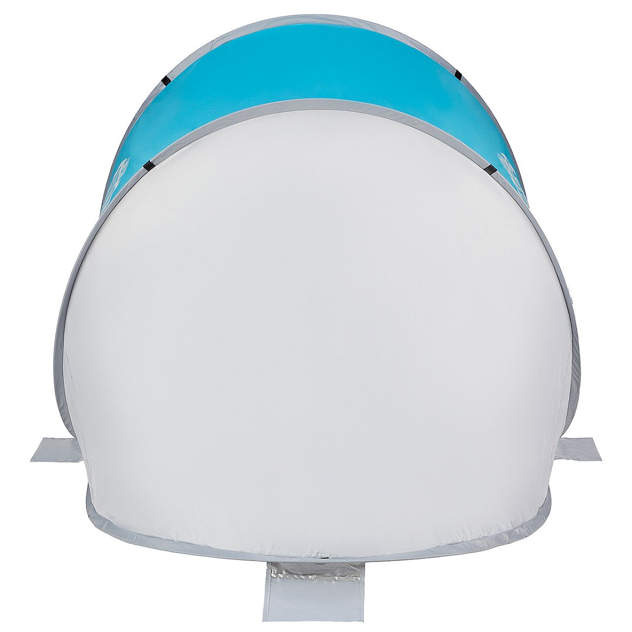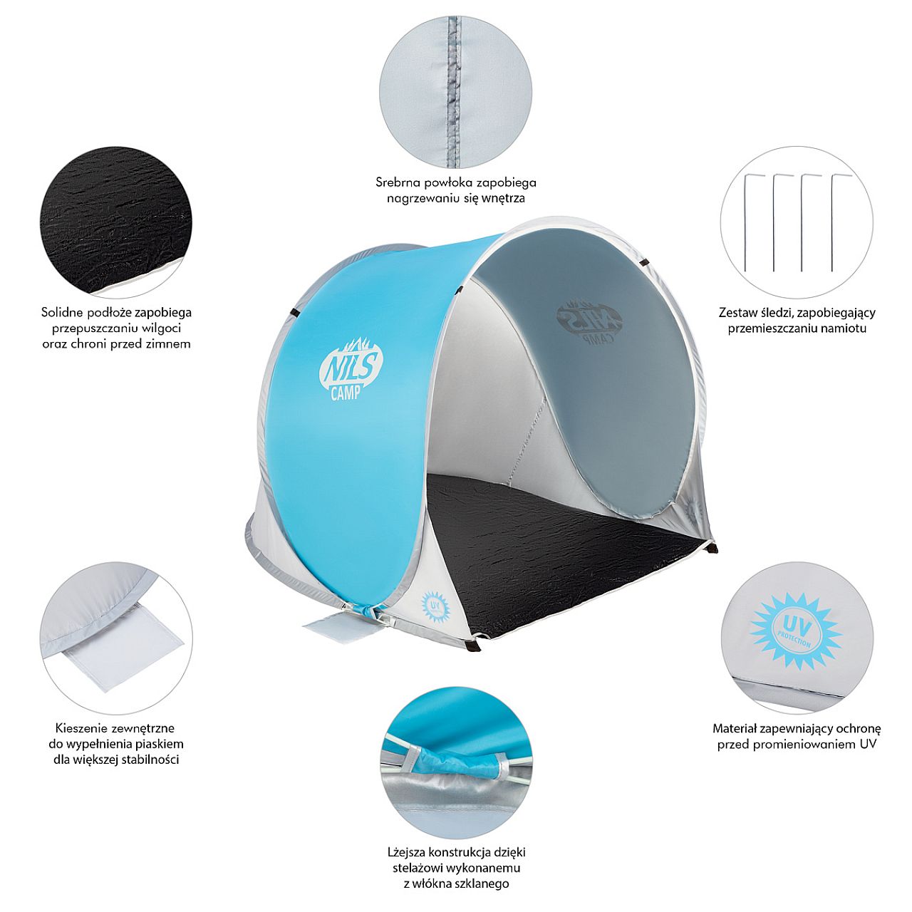 Це саморозкладний пляжний намет. Його розміри гарантують зручність і комфорт використання. Головною перевагою моделі NC3173 є те, що вона сама розкладається. Просто вийміть його з кришки та покладіть на землю. Через кілька секунд намет готовий. В результаті ми можемо швидко віддатися блаженному відпочинку. Завдяки прищіпкам, що входять в комплект, виріб не буде рухатися і немає ризику бути віднесеним вітром. Додатково в наметі є спеціальні кишені, які можна наповнити піском. Вони також призначені для запобігання небажаного руху намету.