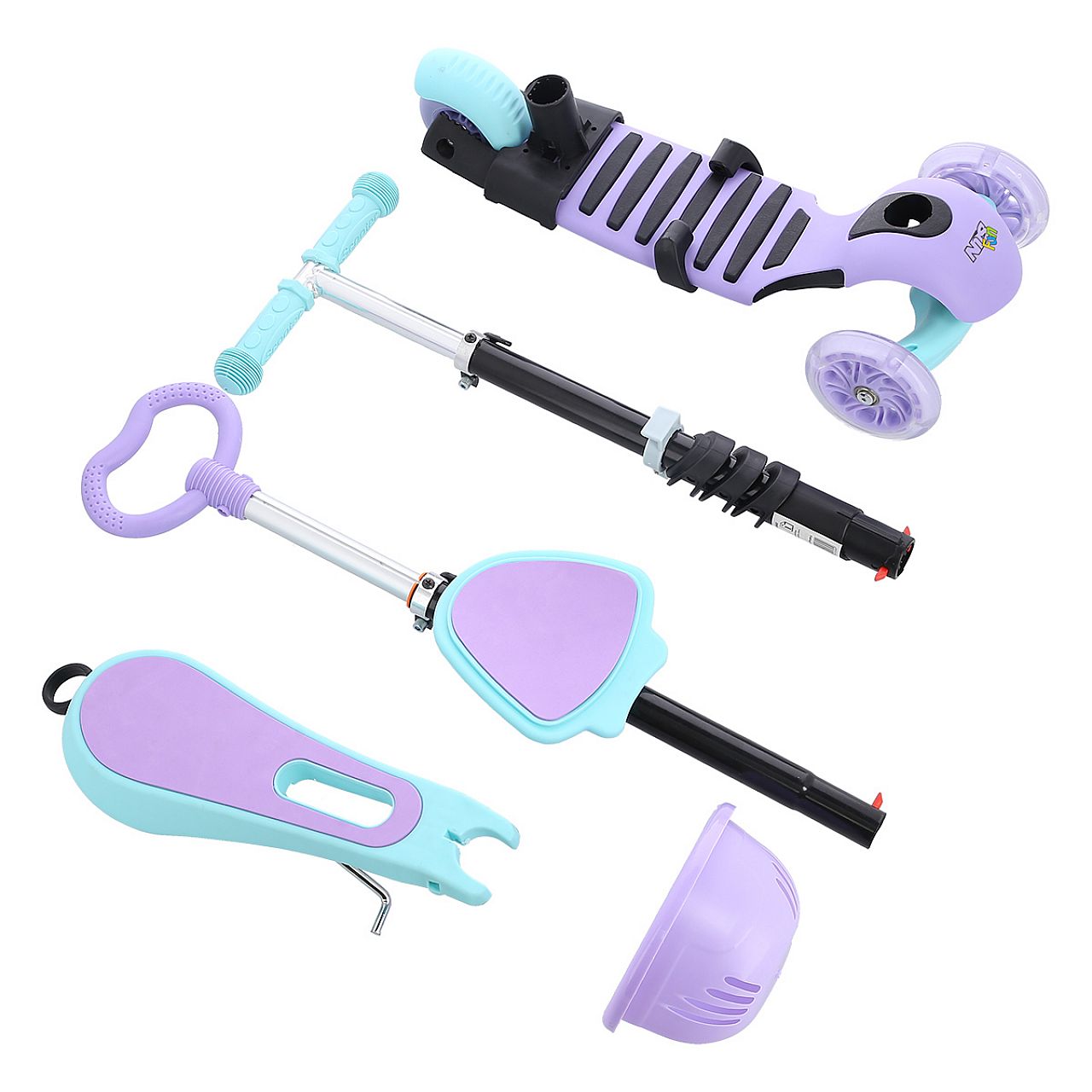 Це поєднання трьох транспортних засобів – їзди, самоката та скейтборду. Додатково до моделі прикріплена ручка, яка дозволить батькам керувати самокатом під час навчання їзді.
