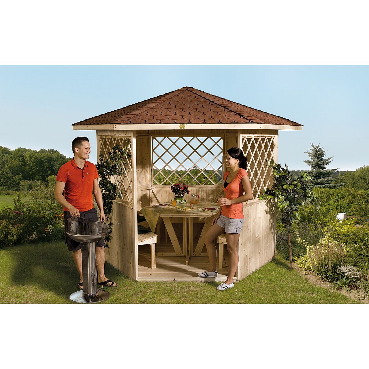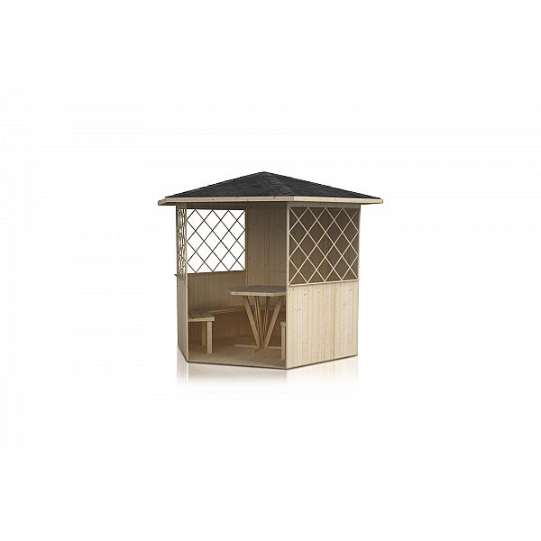 Моменти, проведені в правильній компанії та місці, безцінні. Неповторні емоції, наповнені радістю в саду, подарує дерев'яна альтанка, зроблена з думкою про найвибагливіших людей. Точність обробки та відбір найкращої деревини підтверджують високу якість продукту. Кубічна форма оптимально збільшує площу поверхні та полегшує використання внутрішнього простору. Закриті стіни відмінно захищають від небажаного вітру, а відкрита частина з декоративною решіткою пропускає свіже повітря і теплі сонячні промені. Покрівля, покрита бітумною повстю, забезпечує захист від несприятливих погодних умов. Невеликий дизайн, який дозволить чудово відпочити.