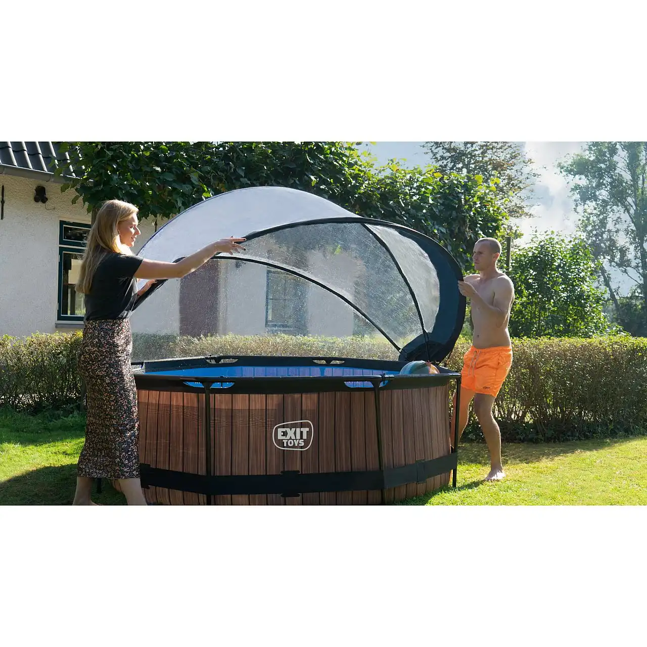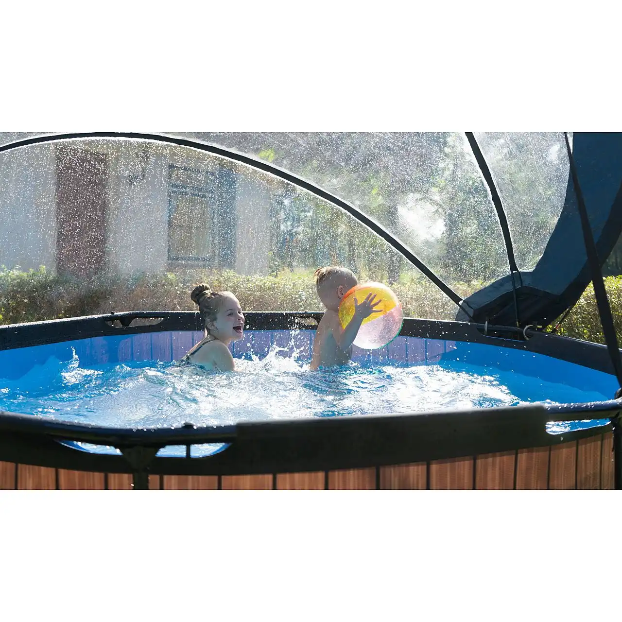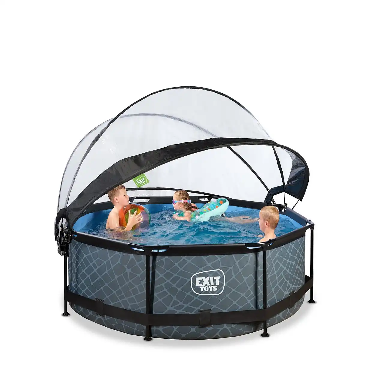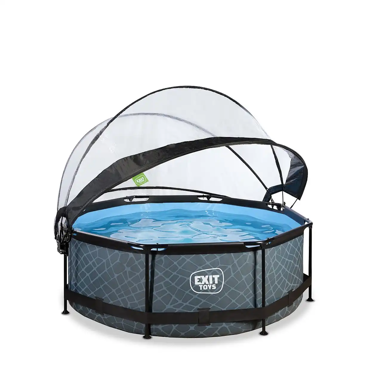 Басейн круглий з куполом EXIT камінь 244 х 76 см компактний каркасний басейн круглої форми, який виглядає лаконічно і елегантно. Із зовнішнього боку - тканина із забарвленням у вигляді кам'яної стіни, що зробить його розміщення в саду, на дачі або у дворі будинку особливо красивим.