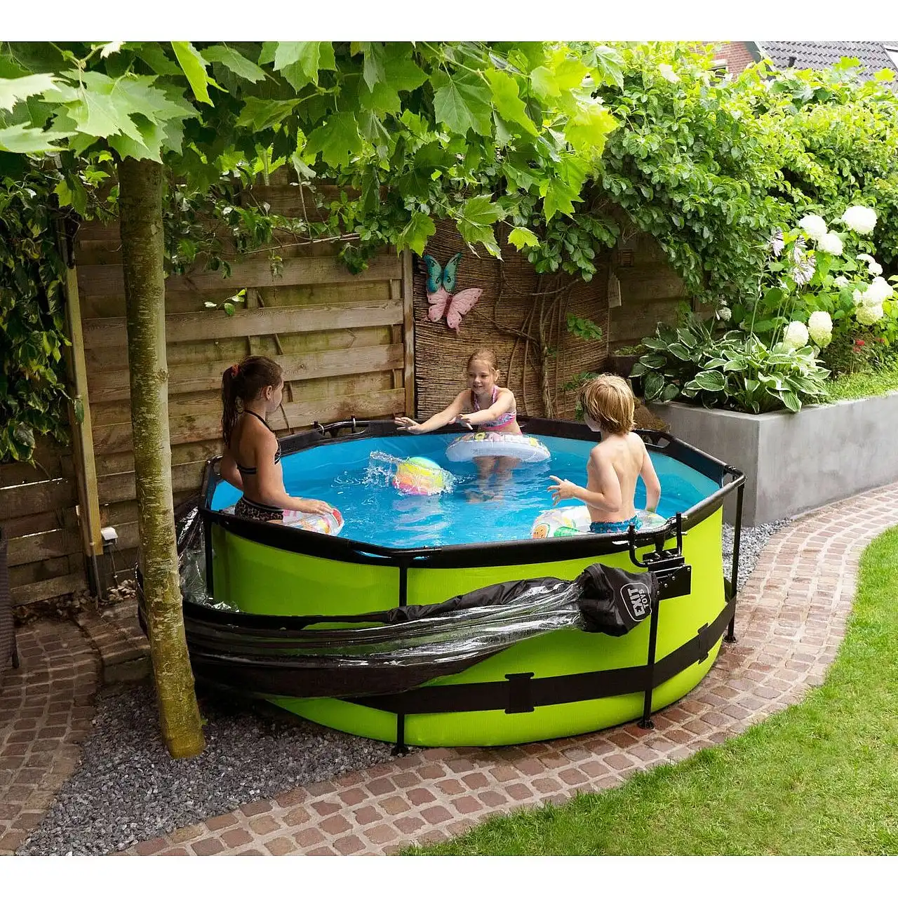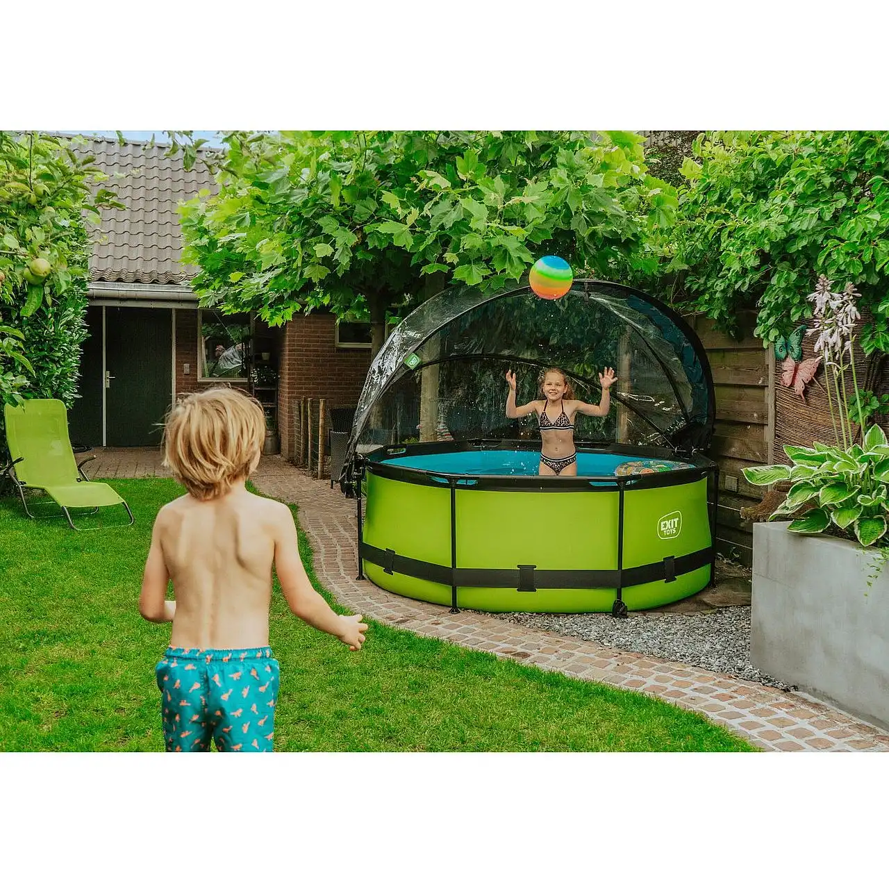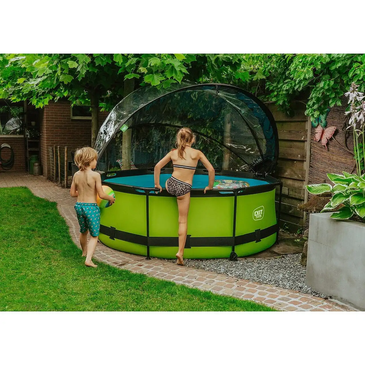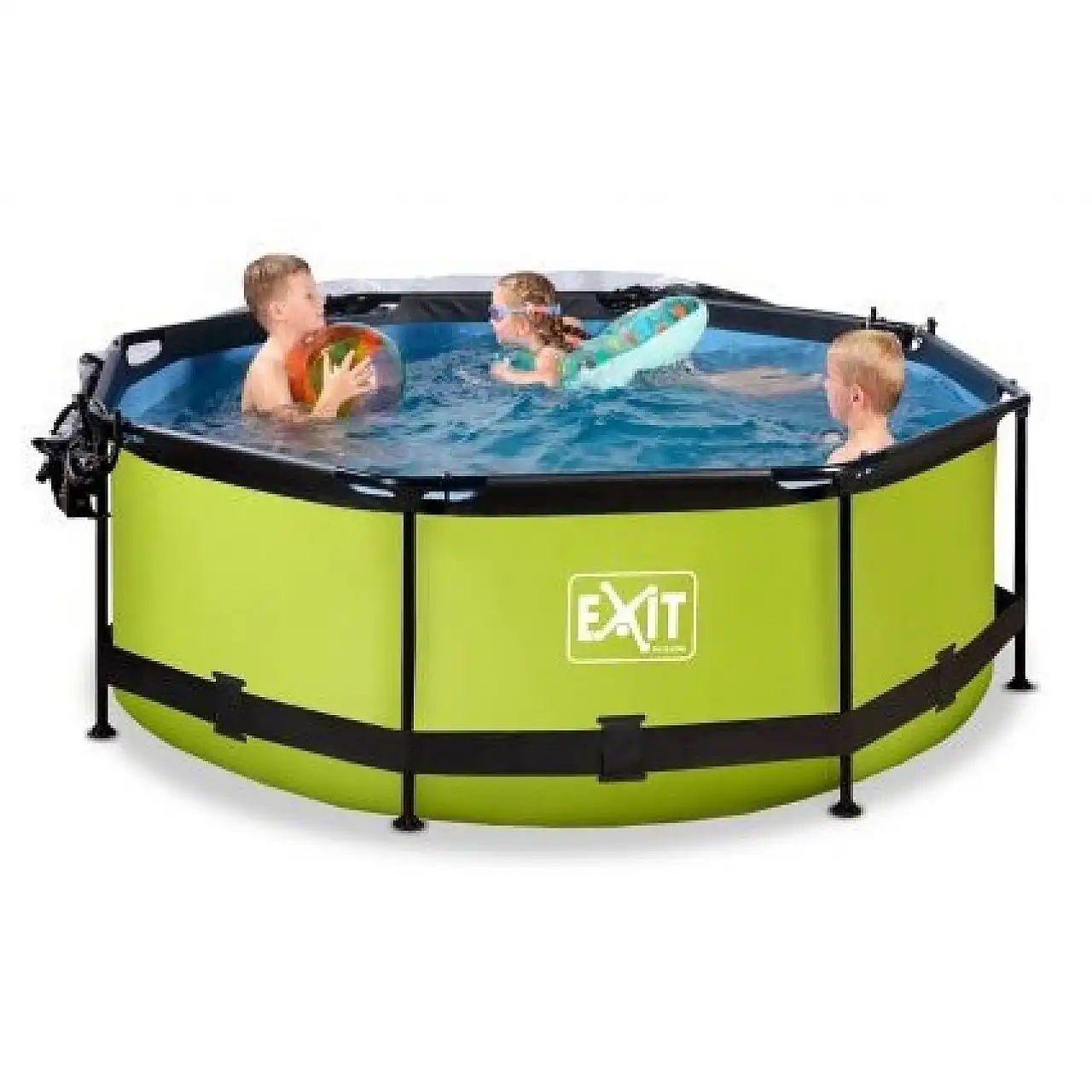Басейн круглий з куполом EXIT "лайм" 244 х 76 см компактний каркасний басейн круглої форми, який виглядає лаконічно і елегантно. Із зовнішнього боку - тканина із забарвленням в кольорі "лайм", що зробить його розміщення в саду, на дачі або у дворі будинку особливо красивим.