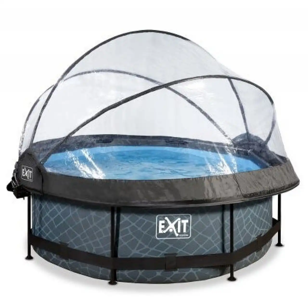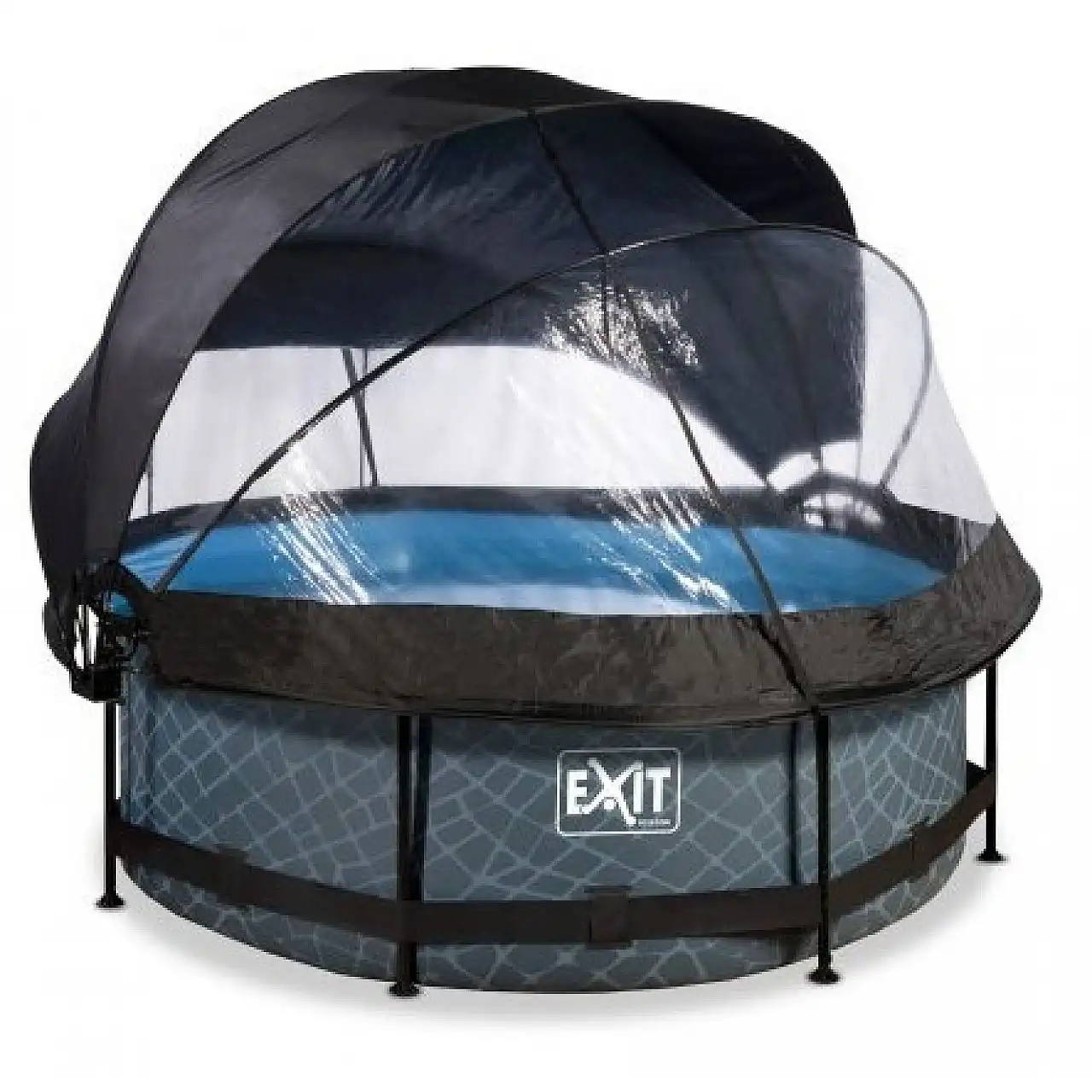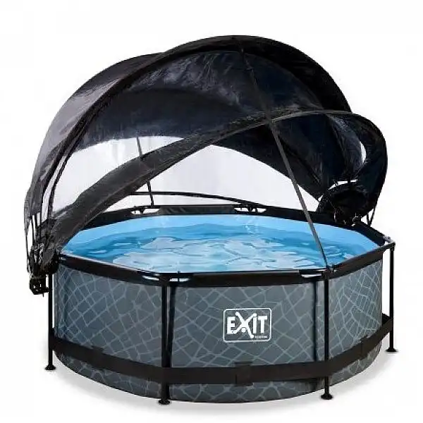 Басейн з куполом EXIT і тентом камінь 244 х 76 см компактний каркасний басейн круглої форми, який виглядає лаконічно і елегантно. Із зовнішнього боку - тканина із забарвленням у вигляді кам'яної стіни, що зробить його розміщення в саду, на дачі або у дворі будинку особливо красивим.