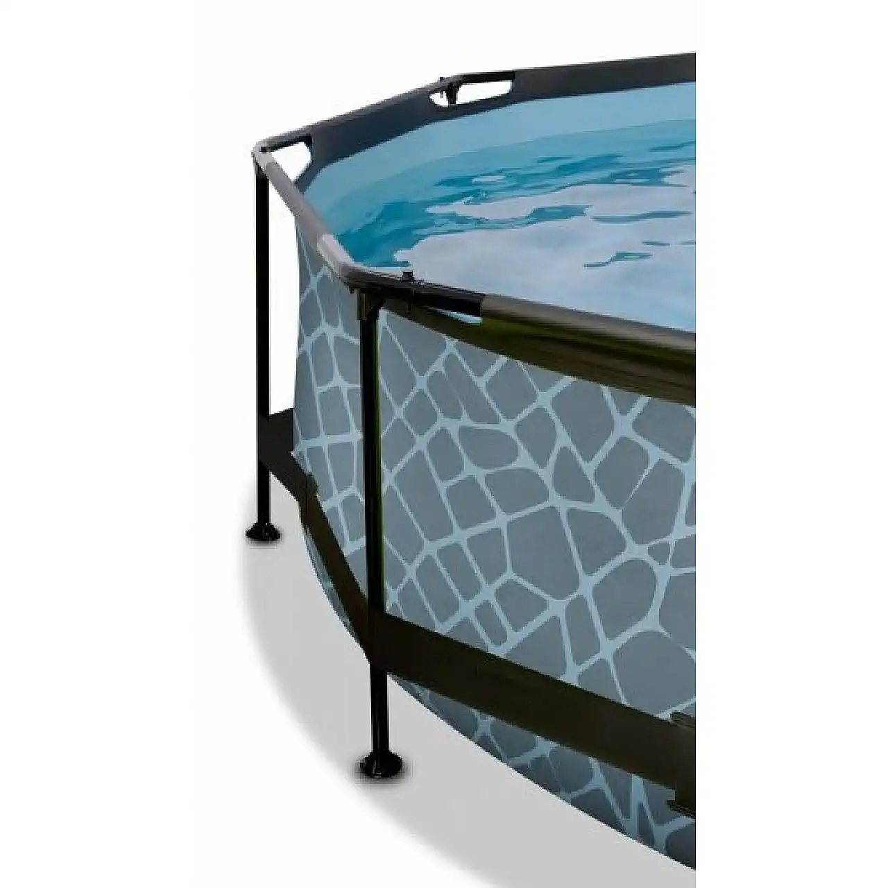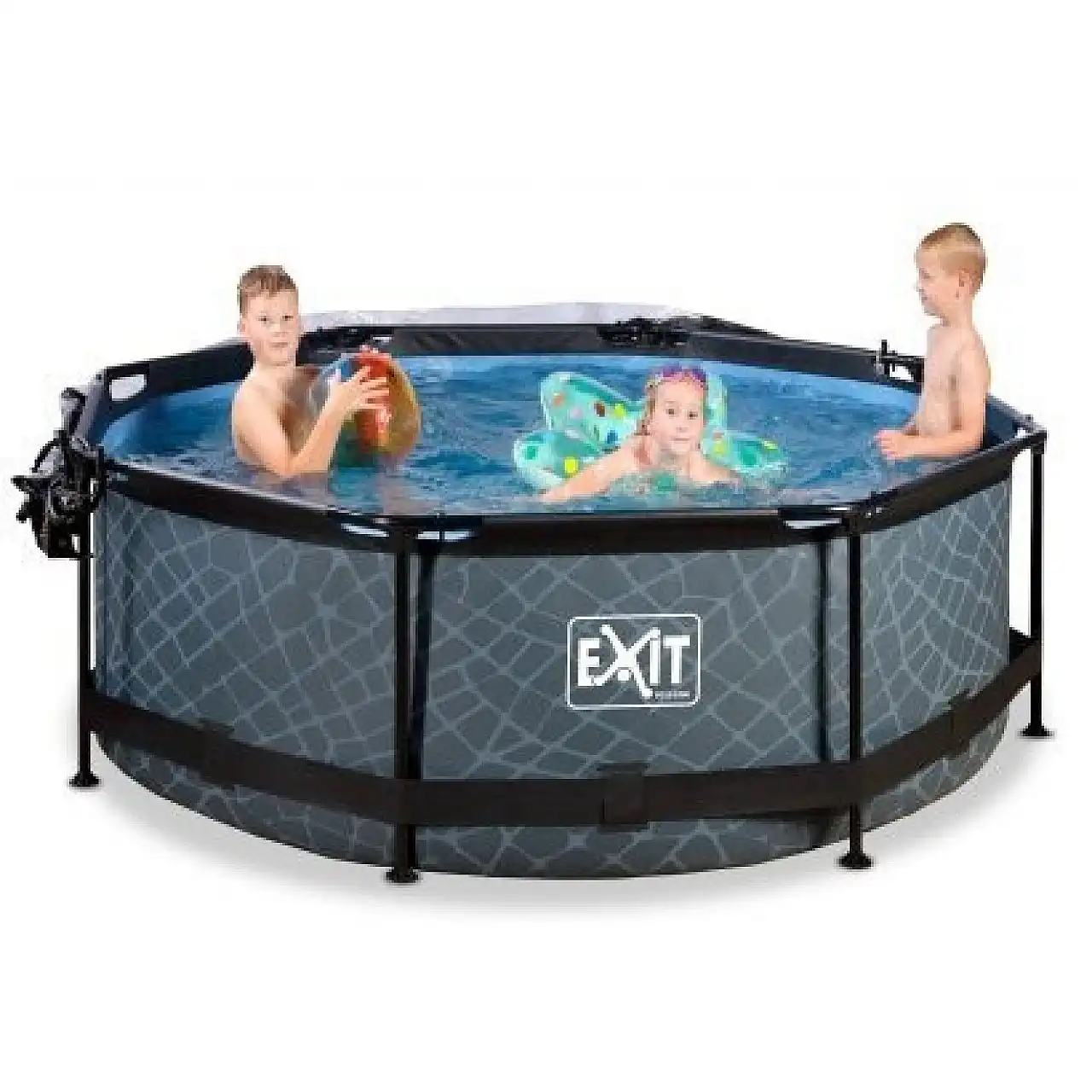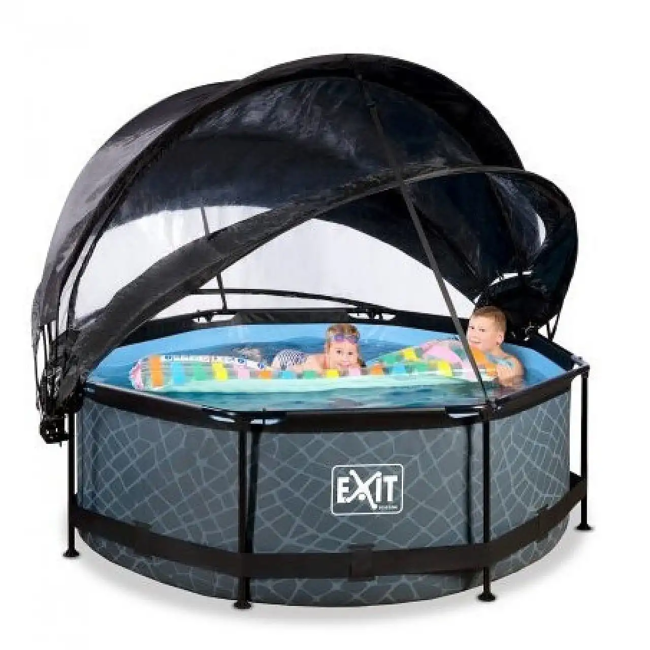 Басейн з куполом EXIT і тентом камінь 244 х 76 см компактний каркасний басейн круглої форми, який виглядає лаконічно і елегантно. Із зовнішнього боку - тканина із забарвленням у вигляді кам'яної стіни, що зробить його розміщення в саду, на дачі або у дворі будинку особливо красивим.