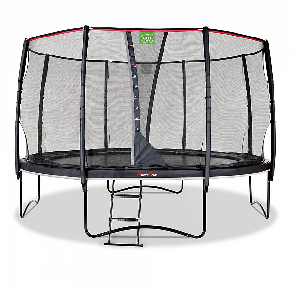 Батут EXIT PeakPro 427 см чорний із захисною сіткою - це круглий батут преміум класу з захистом на пружини чорного кольору, матом для стрибків і пружинами, які в комплексі забезпечують першокласні та комфортні стрибки. Батут має шикарний і статусний зовнішній вигляд, його рама чорного кольору доповнено тонкими кольоровими деталями і світловідбиваючим обідком. Такий батут стане справжньою перлиною навіть у найдорожчому екстер'єрі заміського будинку. Сходи для батута включені в комплект, щоб ви могли швидко і безпечно піднятися на батут.