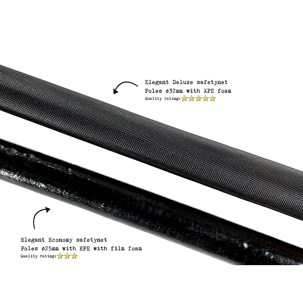 Каркас батута EXIT Elegant дуже міцний і отже стійкий і безпечний. Запатентована рама з унікальними L- образними ніжками була розроблена спеціально, щоб уникнути падіння або нахилу. Навіть якщо діти підстрибують дуже високо і пустують, батут завжди залишатиметься нерухомим. Компанія EXIT Toys називає це "рамою максимальної стабільності" (USF)! Крім того, батут Елегант є яскравим прикладом того, що безпека і дизайн йдуть рука в руку, до того ж виріб виглядає дорого і красиво.