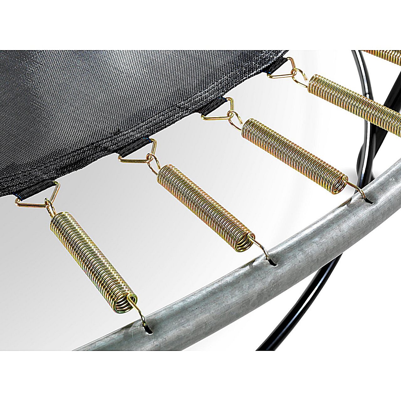Інноваційна система кріплення полегшує і прискорює час на складання рами порівняно з іншими батутами. Чорну спідницю можна швидко прикріпити до захисного краю з допомогою блискавки. Захисна накладка міцна і має систему захисту ніг (FPS), яка була спеціально розроблена компанією EXIT Toys для запобігання попадання ваших ніг пружини під час підстрибування. Протягом короткого часу батут готовий до використання, так чого ж ви чекаєте?