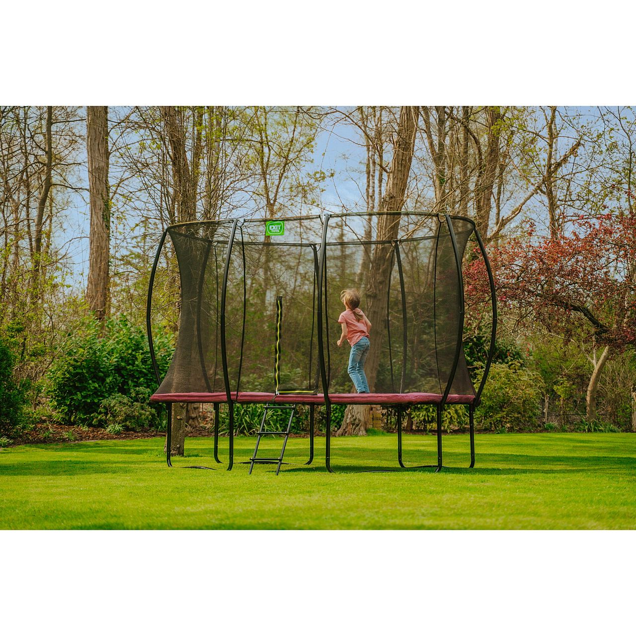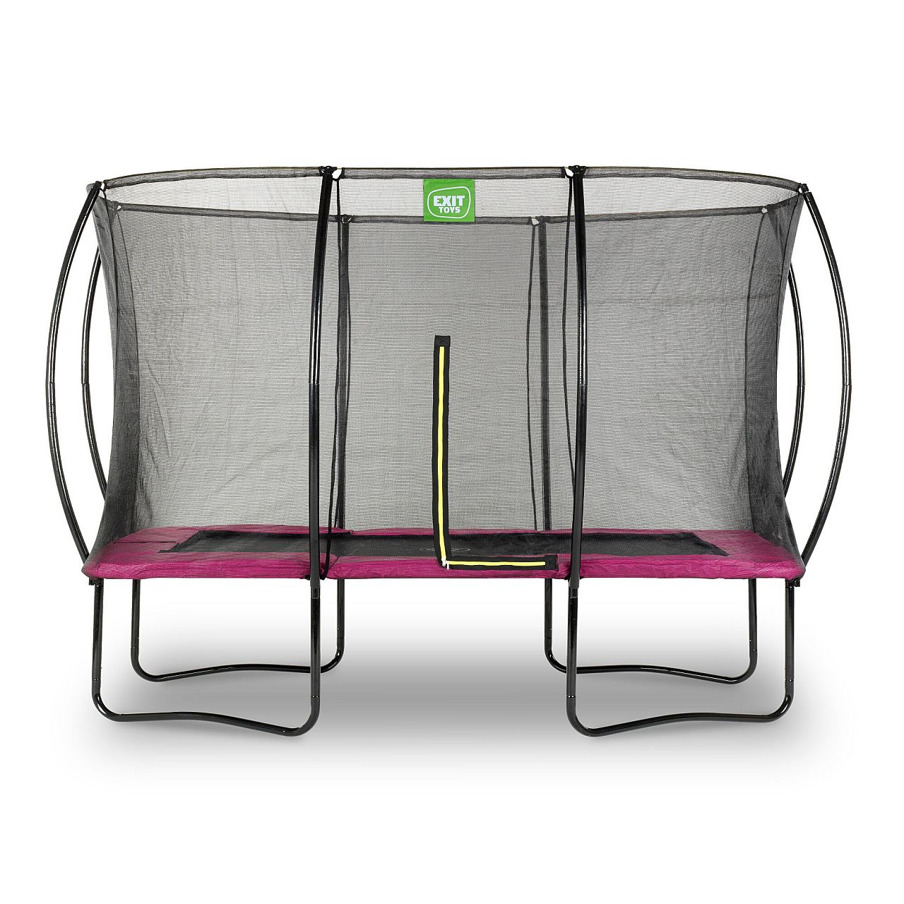 Батут EXIT Silhouette з захисною сіткою прямокутний 244 x 366 см рожевий. Красивий, надійний, довговічний, сучасний і прекрасно розроблений, без сумнівів, буде чудово виглядати в будь-якому саду або дворі будинку. Конструкція досить стійка і поставляється в комплекті з захисною сіткою, яка зручно відкривається з допомогою флуоресцентної блискавки зеленого кольору, так що Ви відразу зможете побачити закрита блискавка належним чином. Рама батута має контрастний чорний матовий колір , а захист на пружини - яскраво-салатовий, що робить його елегантним і привабливим.