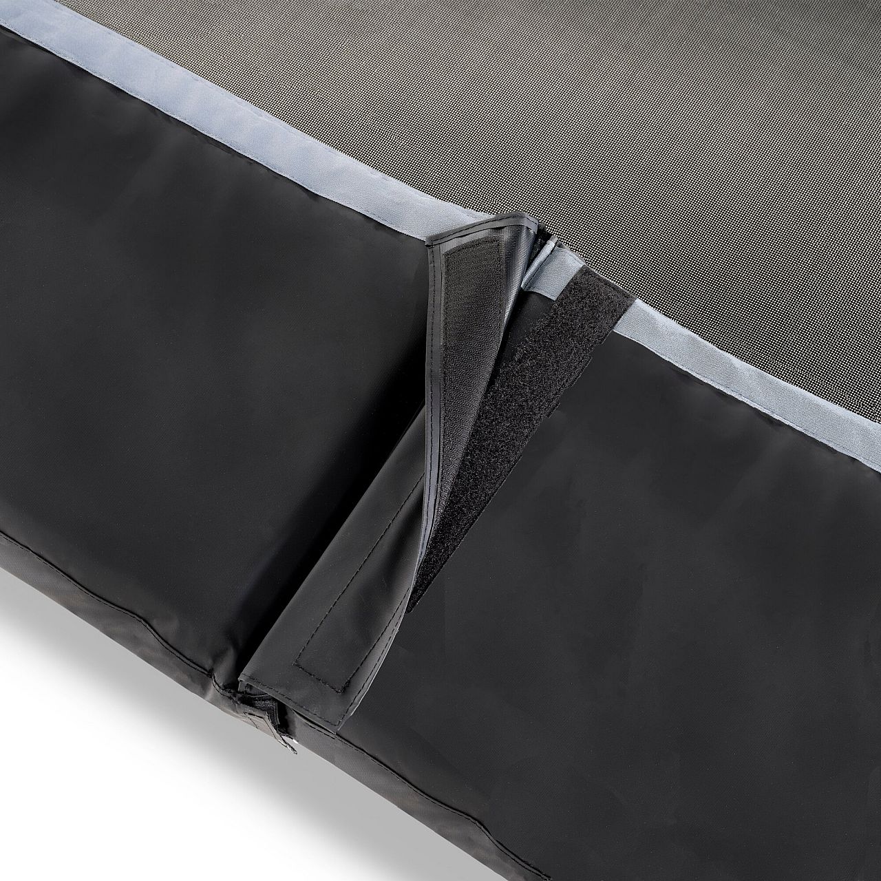 Батут EXIT PeakPro прямокутний 244 х 427 см чорний із захисною сіткою - це прямокутний батут преміум класу із захистом на пружини чорного кольору, матом для стрибків і пружинами, які в комплексі забезпечують першокласні і комфортні стрибки. Батут має шикарний і статусний зовнішній вигляд, його рама чорного кольору доповнена тонкими колірними деталями і обідком що відбиває світло. Такий батут стане справжньою перлиною навіть в найдорожчому екстер'єрі заміського будинку. Сходи для батута включені в комплект, чтобы вы могли швидко і безпечно піднятися на батут.