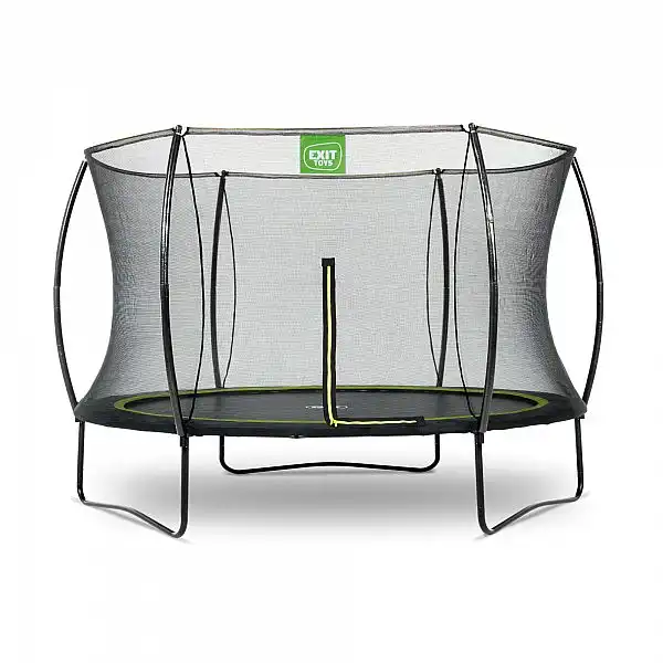 Батут EXIT Silhouette 305 см чорний - красивий, надійний, довговічний, сучасний і прекрасно розроблений, без сумнівів, буде чудово виглядати в будь-якому саду або дворі будинку. Конструкція досить стійка і поставляється в комплекті з захисною сіткою, яка зручно відкривається з допомогою флуоресцентної блискавки. Батут має контрастний чорний матовий колір з включеннями яскраво-зелених акцентів, що робить його елегантним і привабливим.