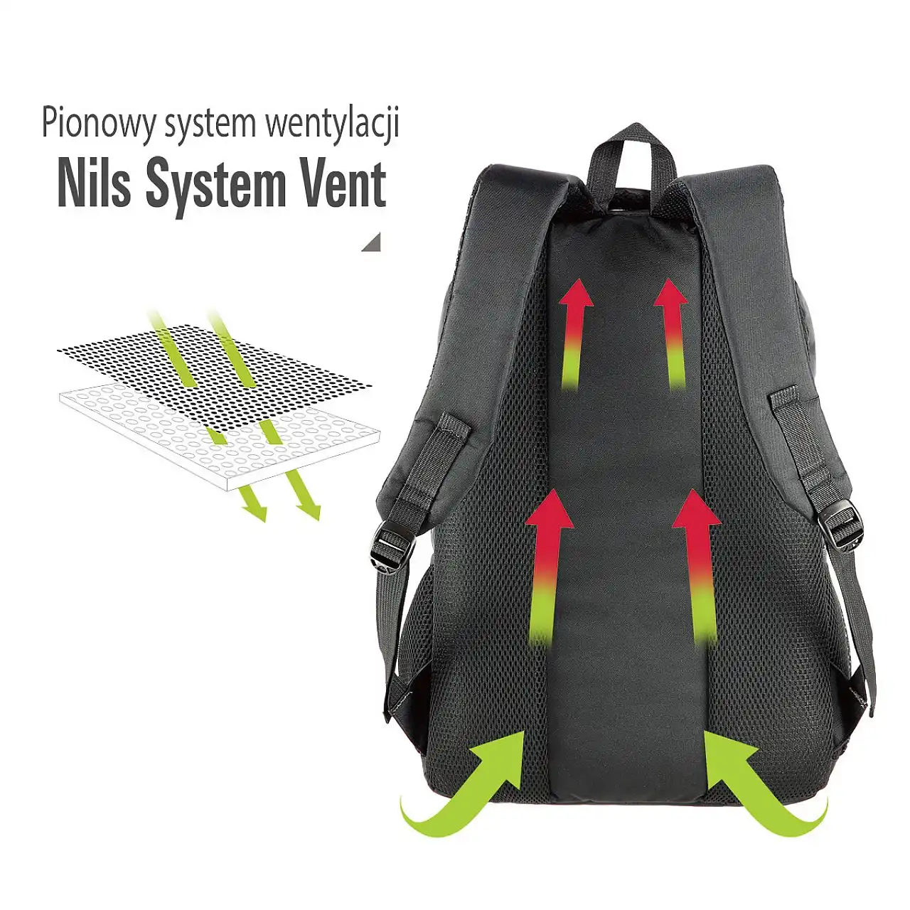 Виріб CBC7097 від Nils Camp - універсальний рюкзак для всіх любителів міських прогулянок. У рюкзак об'ємом до 30 літрів поміститься все необхідне. Він оснащений 4x передніми кишенями на блискавці та 2x бічними сітчастими кишенями. Додатково в основній кишені є відділення для ноутбука. Задня стінка рюкзака посилена і має систему Nils Vent System, рішення, завдяки якому повітря вільно циркулює в будь-який час, що забезпечує високий комфорт використання навіть під час тривалих походів. Крім того, матеріал, з якого виготовлений рюкзак CBC7097, є водонепроникним на рівні 900 мм, що ефективно захищає рюкзак від намокання.